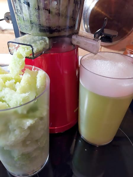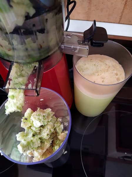 6 минут 47 секунд, 560 граммов, 570 миллилитров, немного пены. Очень своеобразный остро-сладкий вкус, бодрит! А вот жмых очень сочный (опять), да и сока некоторые соковыжималки из того же количества капусты выжимают больше.