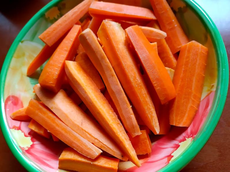 1 килограмм чищеной моркови разрезали на дольки.