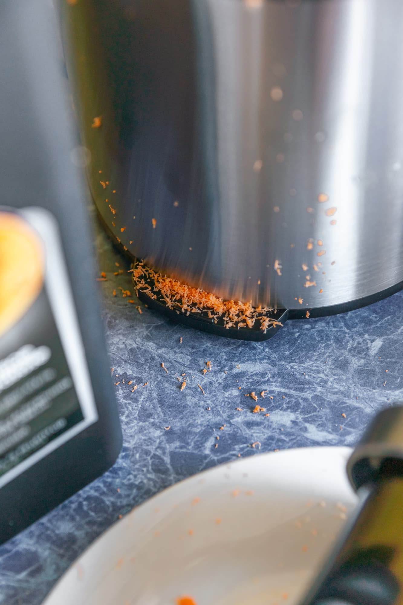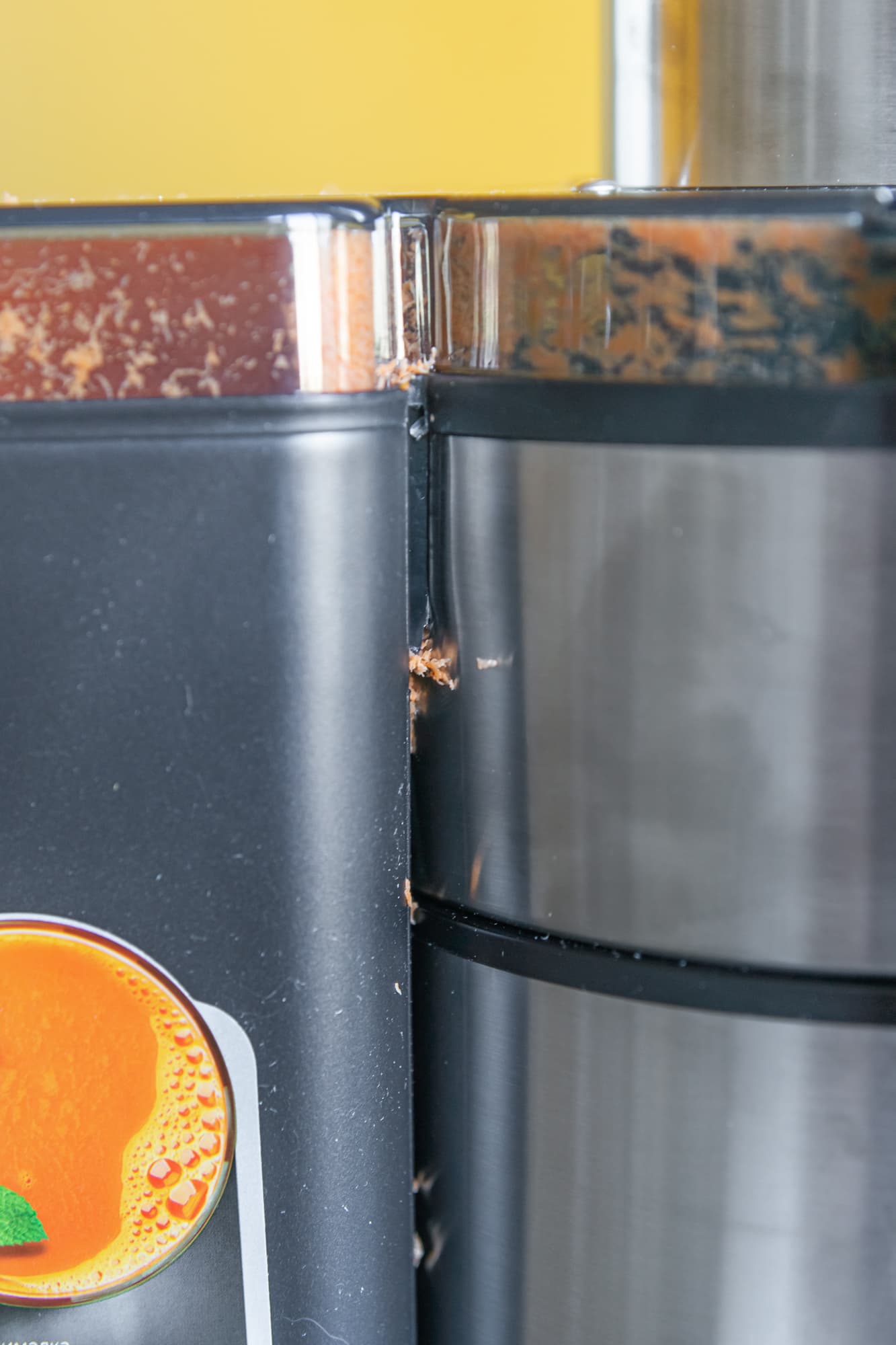 Конструкция соковыжималки такова, что контейнер для отходов не фиксируется на корпусе, а лишь приставляется к нему и прижимается сверху крышкой. Прижимается он не так сильно, как хотелось бы, оставляя между кувшином и основным корпусом маленькую щель. Мы поначалу не обратили на нее внимания. Зато включив соковыжималку на 4-й скорости и закинув в горловину морковь, мы получили небольшой салют из переработанного жмыха. Брызг сока не было.