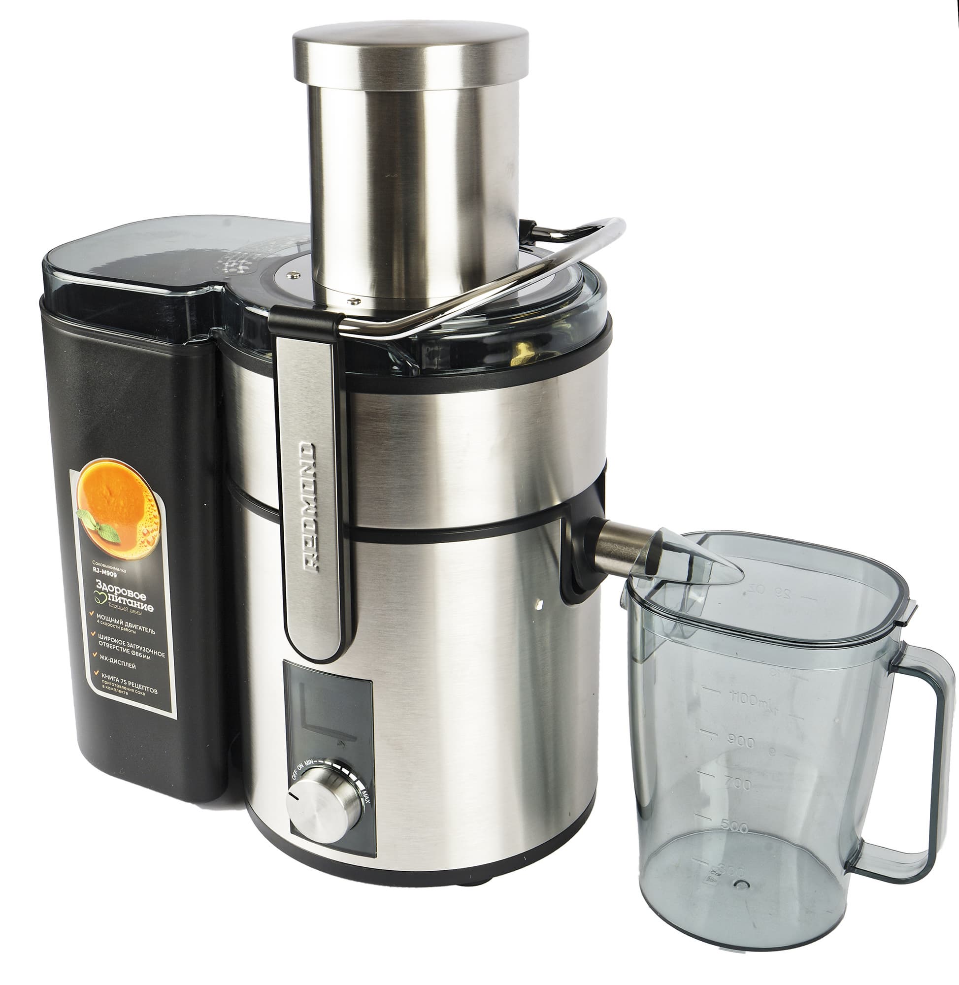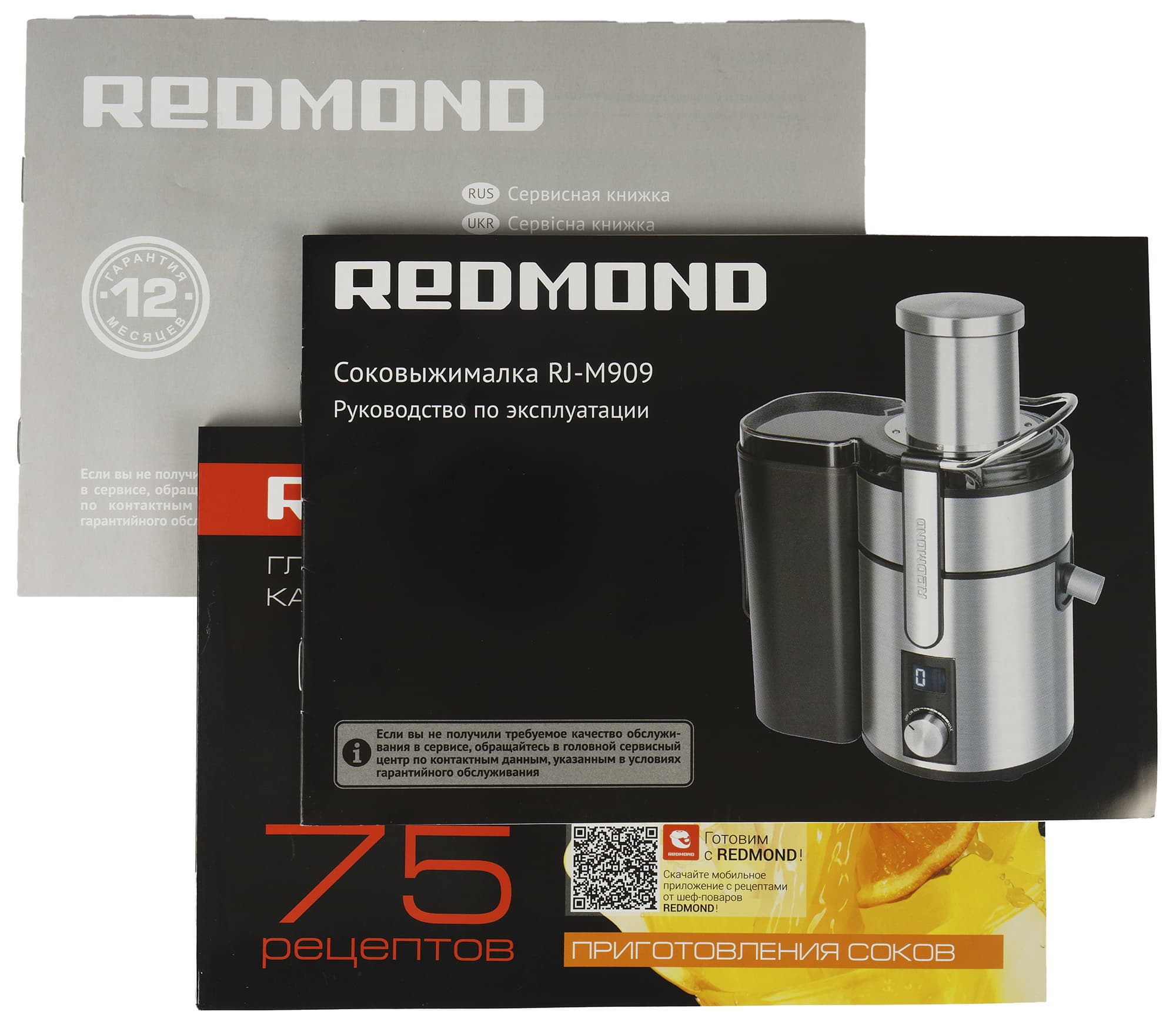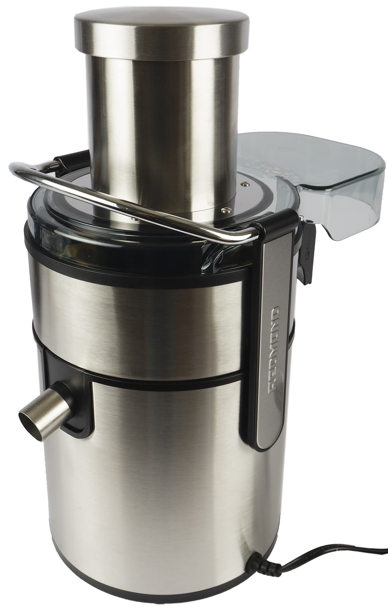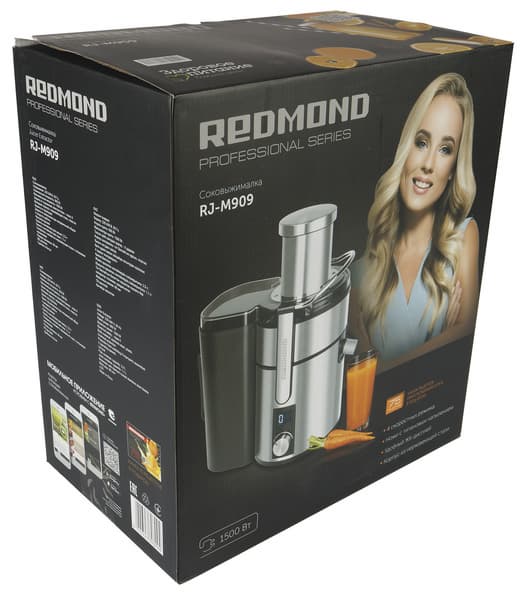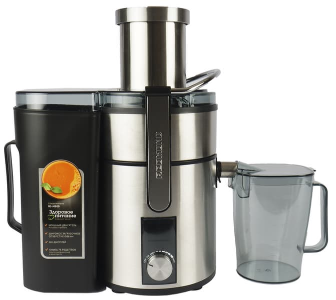 Центробежная соковыжималка Redmond RJ-M909 с двигателем мощностью 1500 Вт работает на 4 скоростях, имеет широкое загрузочное отверстие диаметром 86 мм и вместительные контейнеры: 1,1 л для сока и 2,5 л для отходов.