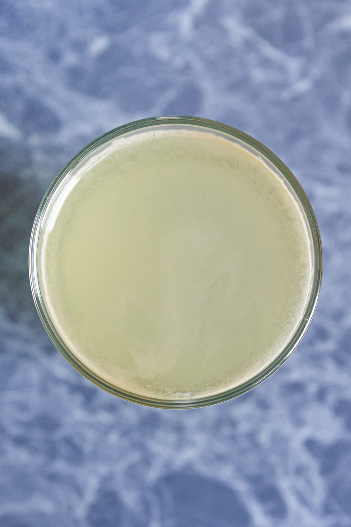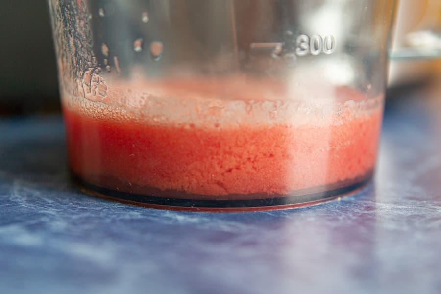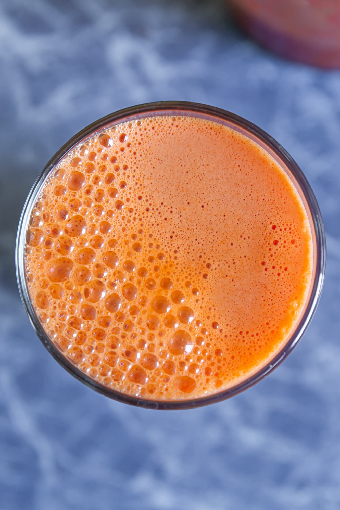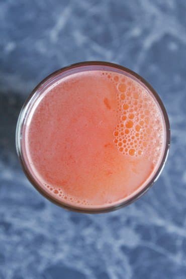 Мякоти в соке мы не увидели, прозрачную жидкость сверху накрывала густая шапка пены.