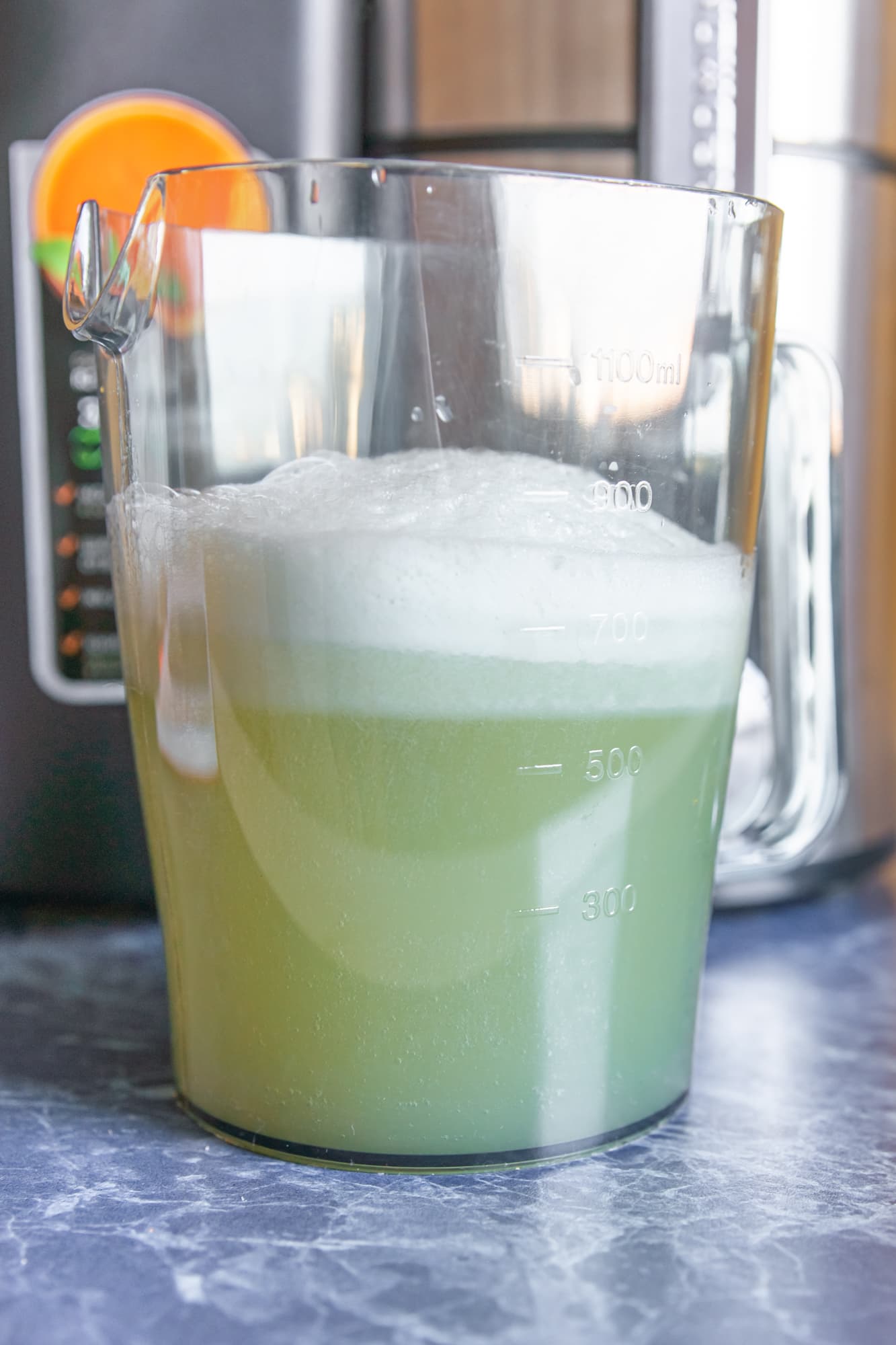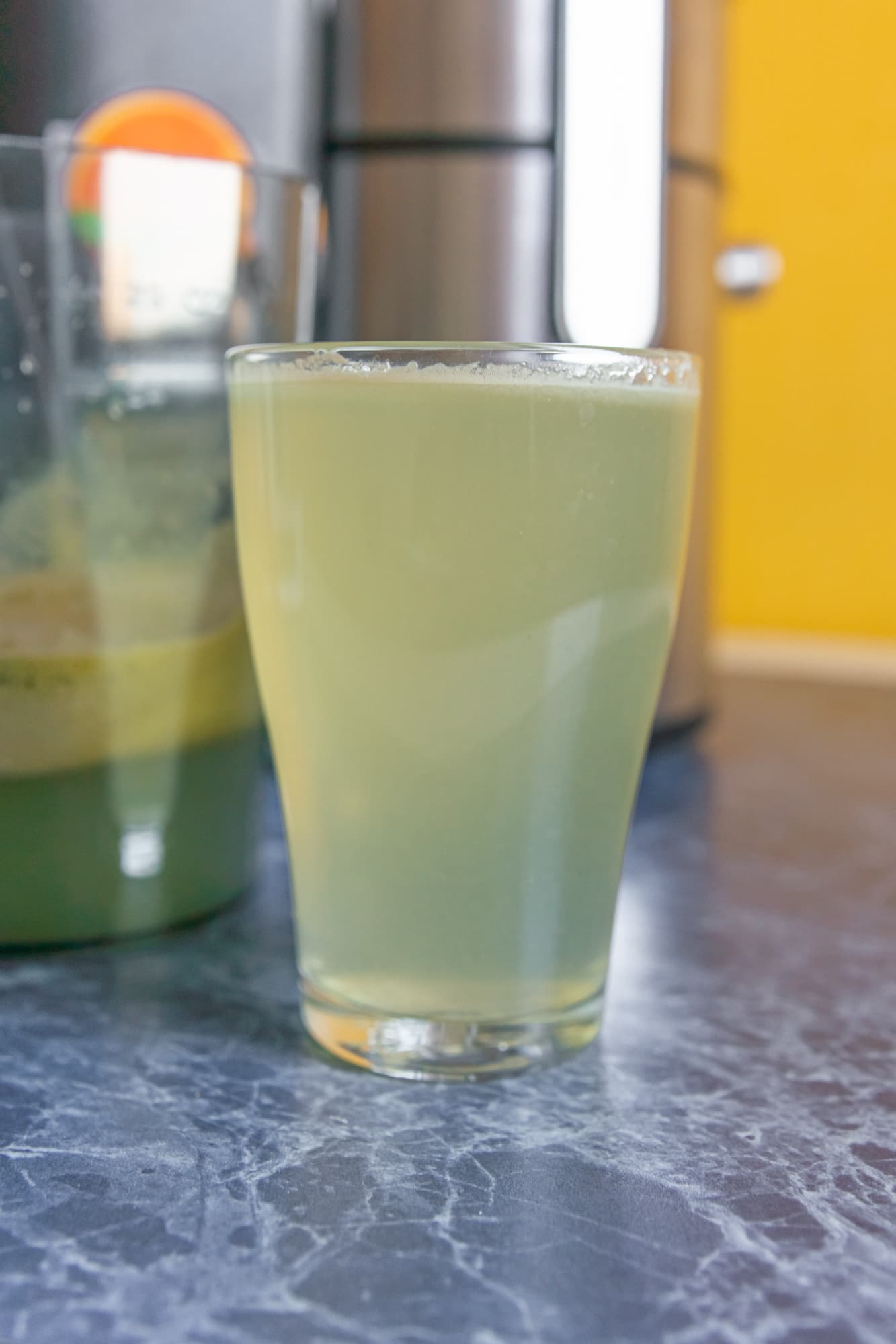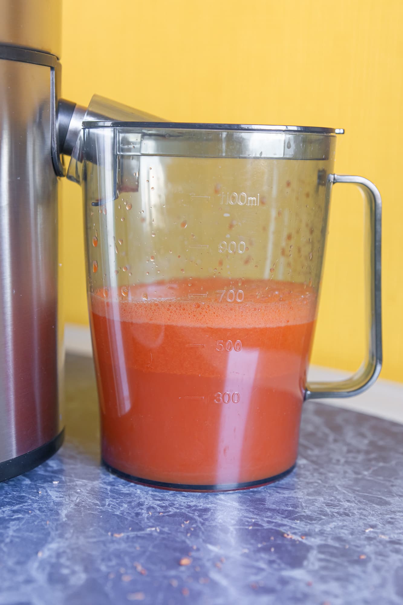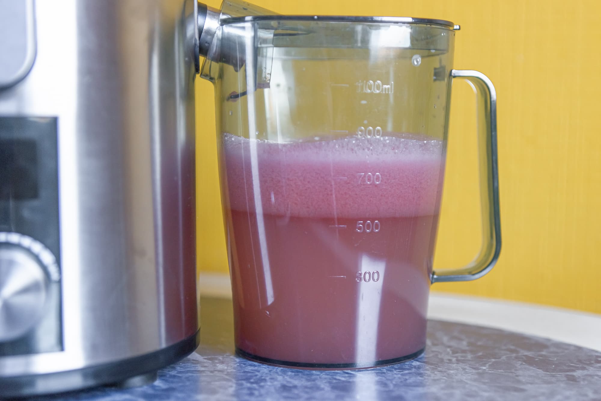 Сок, скопившийся в контейнере, получился отличный — жидкий, без мякоти, с небольшим количеством пены.