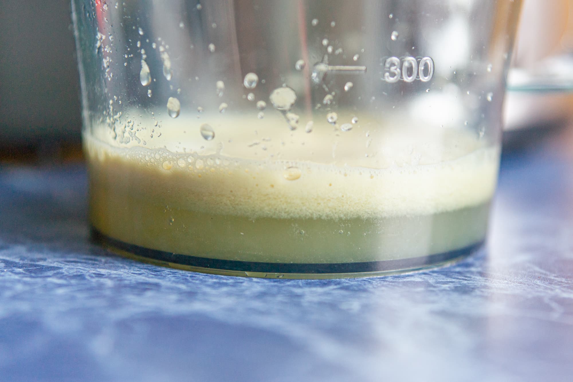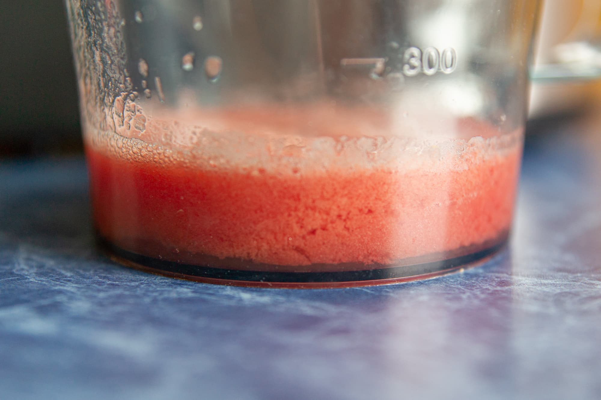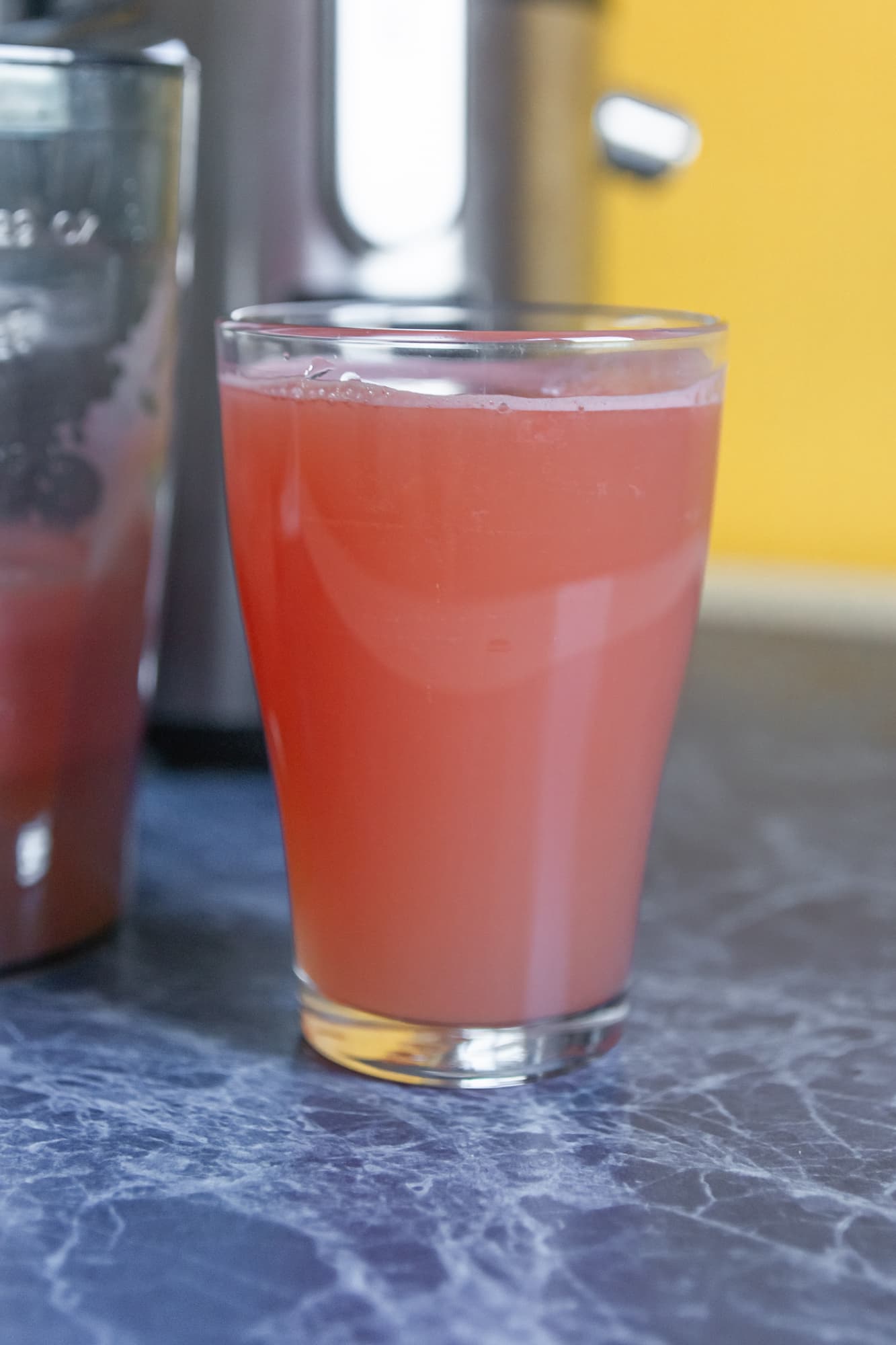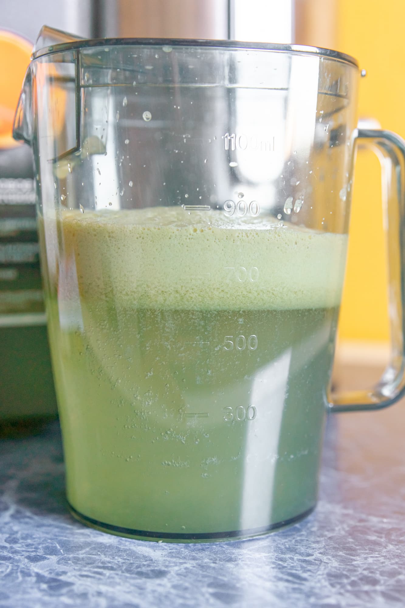 Сок, скопившийся в контейнере, получился отличный — жидкий, без мякоти, с небольшим количеством пены.