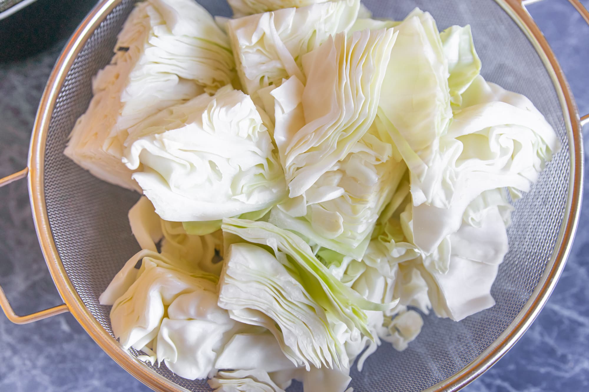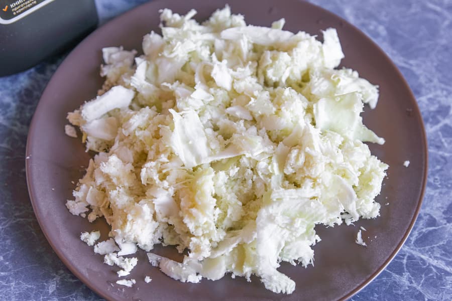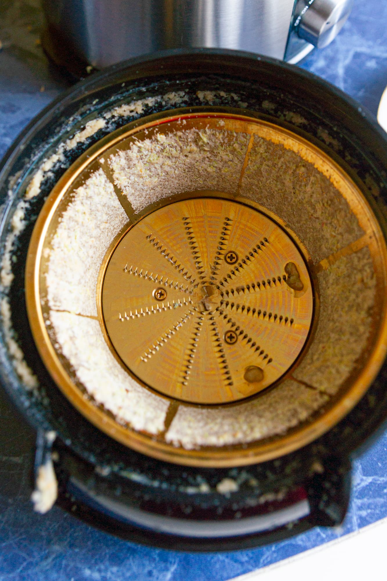 Нарезанный на крупные куски, соответствующие размеру горловины, килограмм капусты мы быстро закидывали в загрузочное отверстие соковыжималки, работающей на 3-й скорости.