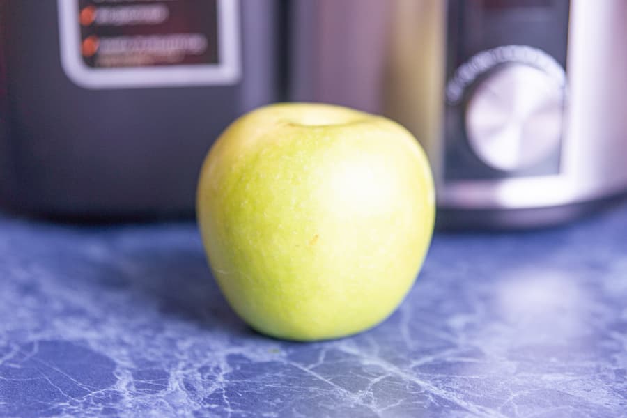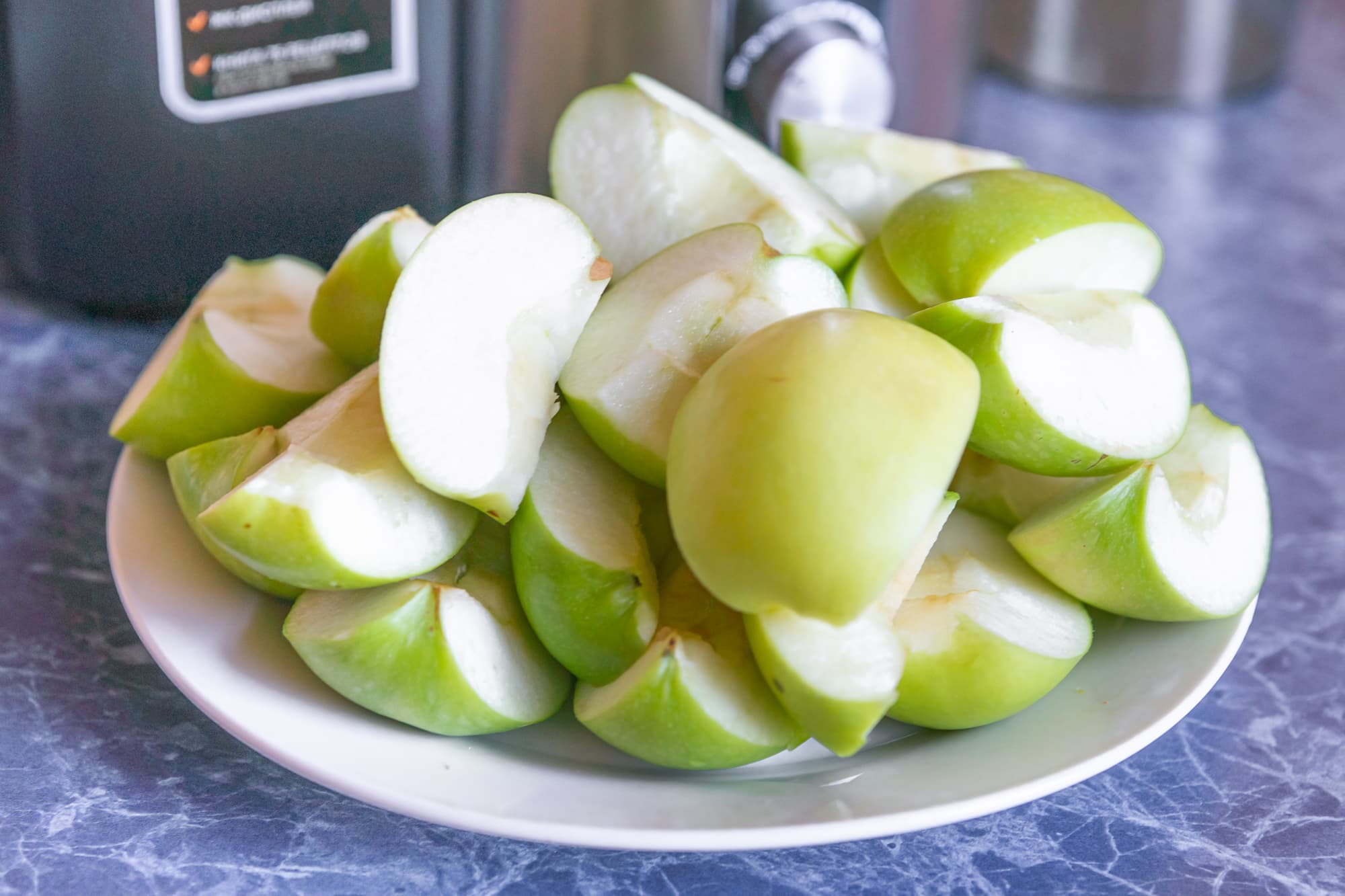 Нам не очень понравился процесс выжимания сока из целого яблока, так что мы вернулись к обычной процедуре подготовки фруктов — разрезали плоды на 4 части и удалили сердцевину с косточками.