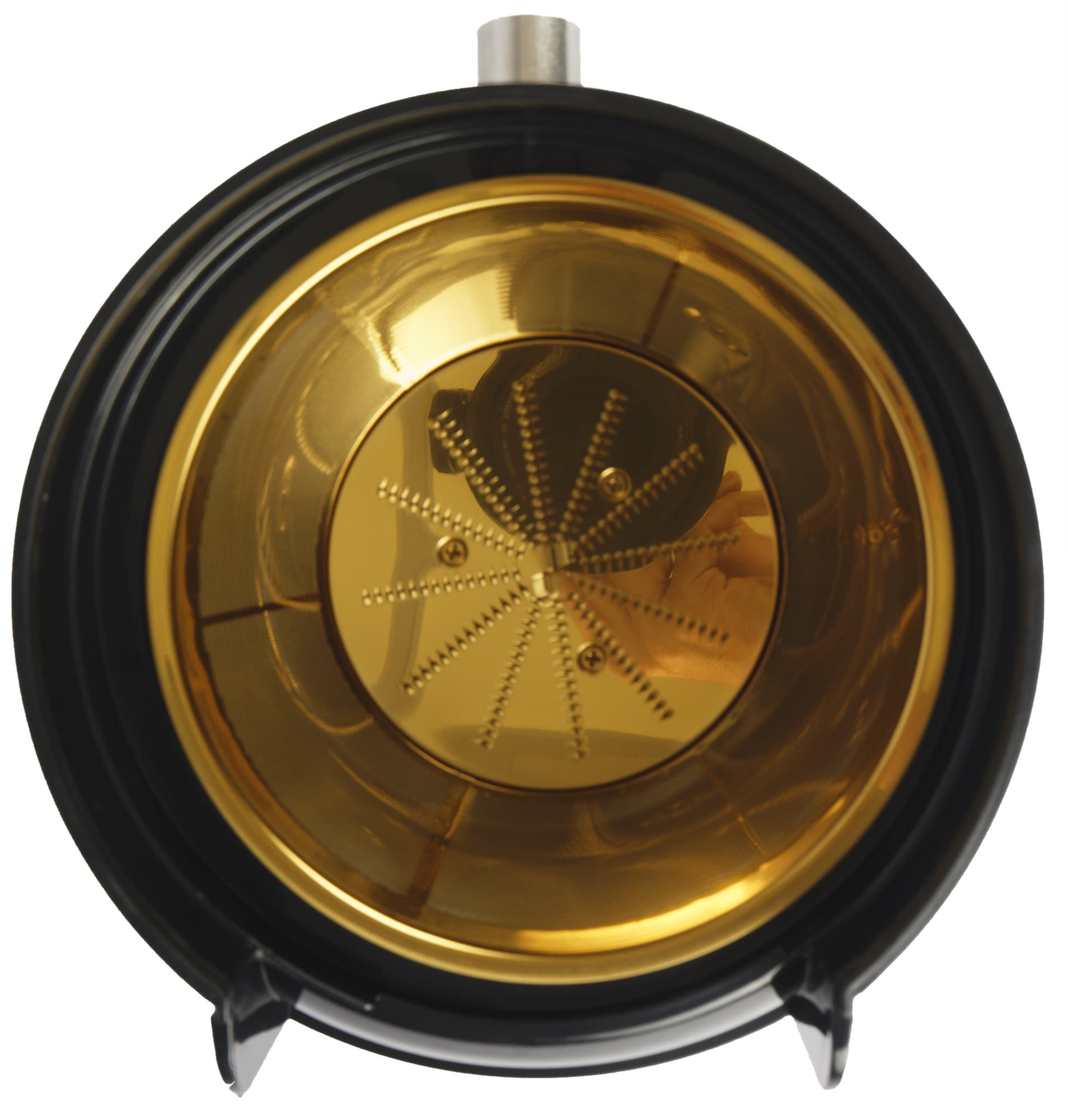 В нижней части основания (моторного блока) соковыжималки располагается панель управления с ЖК-дисплеем. В самом основании, как и положено, прячется двигатель. Сбоку справа виднеется съемный носик, слева к корпусу крепится контейнер для отходов. У носика два положения: направленный немного вниз — подача сока в обычном режиме, приподнятый до горизонтального положения — подача сока прекращена.