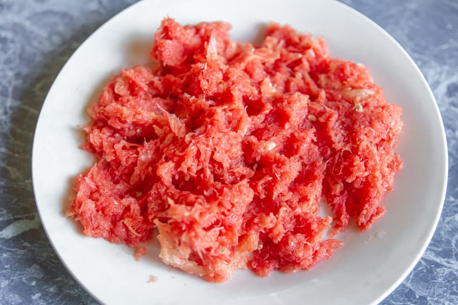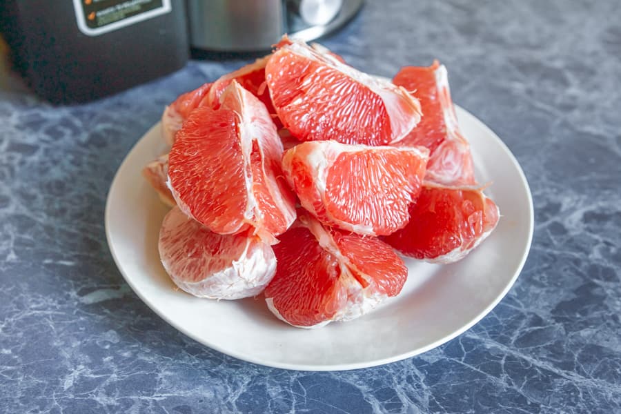 Очищенные грейпфруты общим весом в один килограмм мы разломали на 4 части. Мягкий сочный фрукт перерабатывали на 2-й скорости.