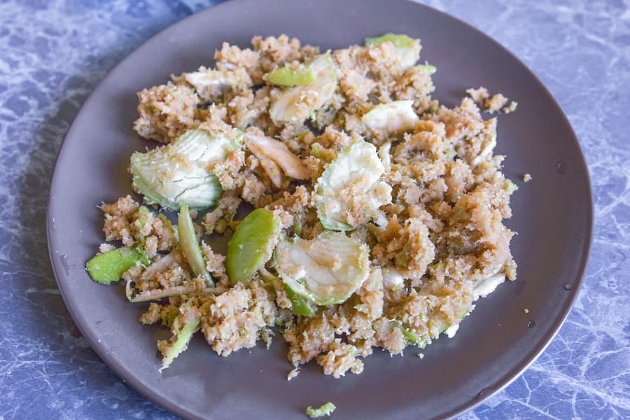 Жмых довольно сухой с небольшим количеством обрывков капустных листов.
