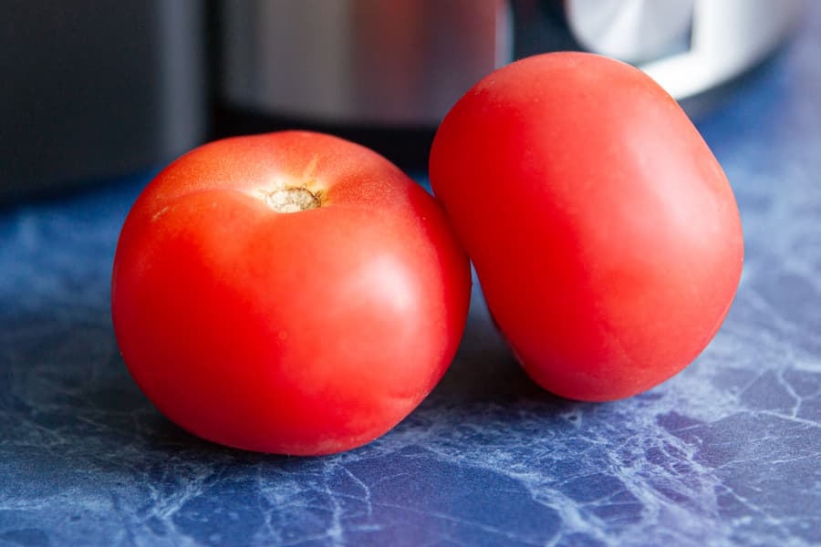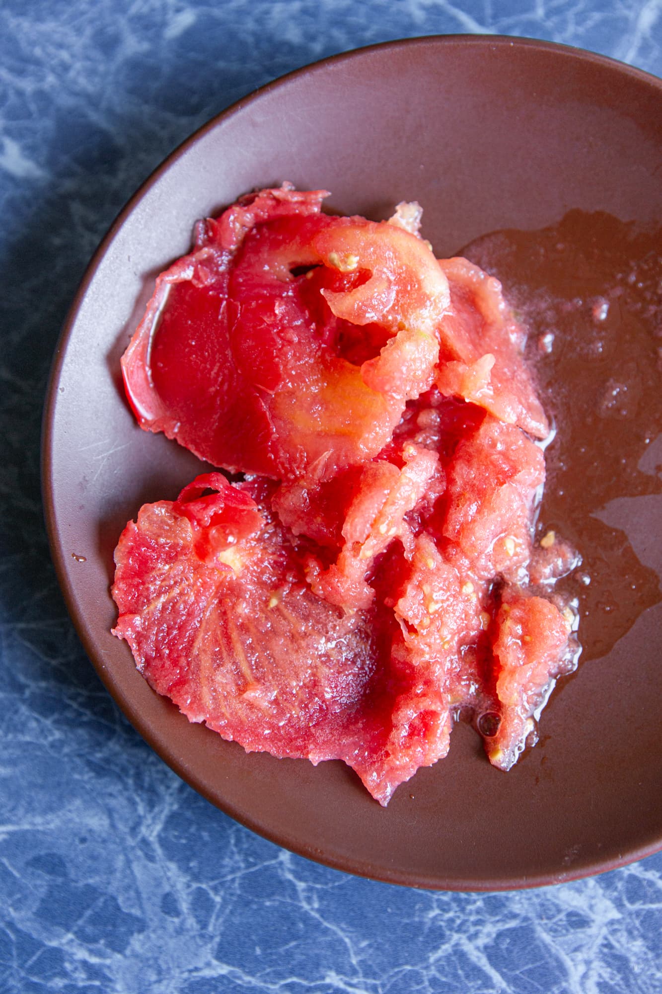 Пару томатов мы также опустили в горловину целиком, на этот раз включив 1-ю скорость.