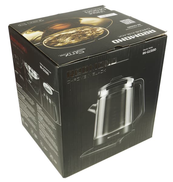 У нас на тестировании чайник Redmond RK-G1310D, соответствующий запросам современного потребителя: нагрев воды с точностью до 1 °C, поддержание заданной температуры, симпатичный дизайн, надежная контактная группа Strix, которая рассчитана на более чем 12 тысяч циклов включения и выключения. Рассмотрим прибор подробнее.
