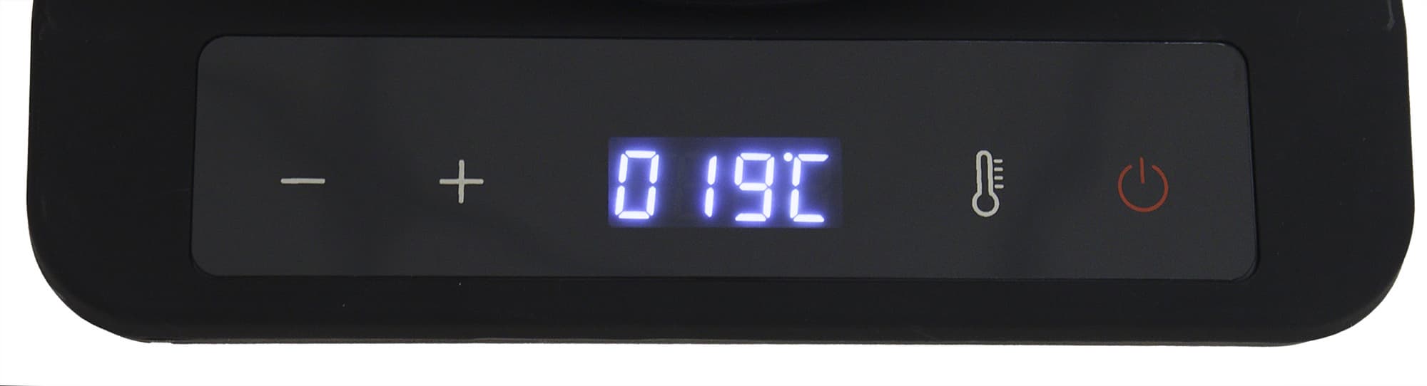 Панель управления состоит из дисплея посередине, кнопок «+» и «−», отвечающих за установку температуры слева от дисплея, кнопок выбора температуры и включения справа от дисплея.