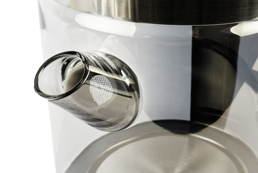 В стеклянный носик корпуса вставляется фильтр от накипи. Он полностью вынимается и представляет собой крупную сетку в силиконовом корпусе. Фильтр держится в носике за счет трения. Носик аккуратно влит в колбу корпуса, шов не заметен.