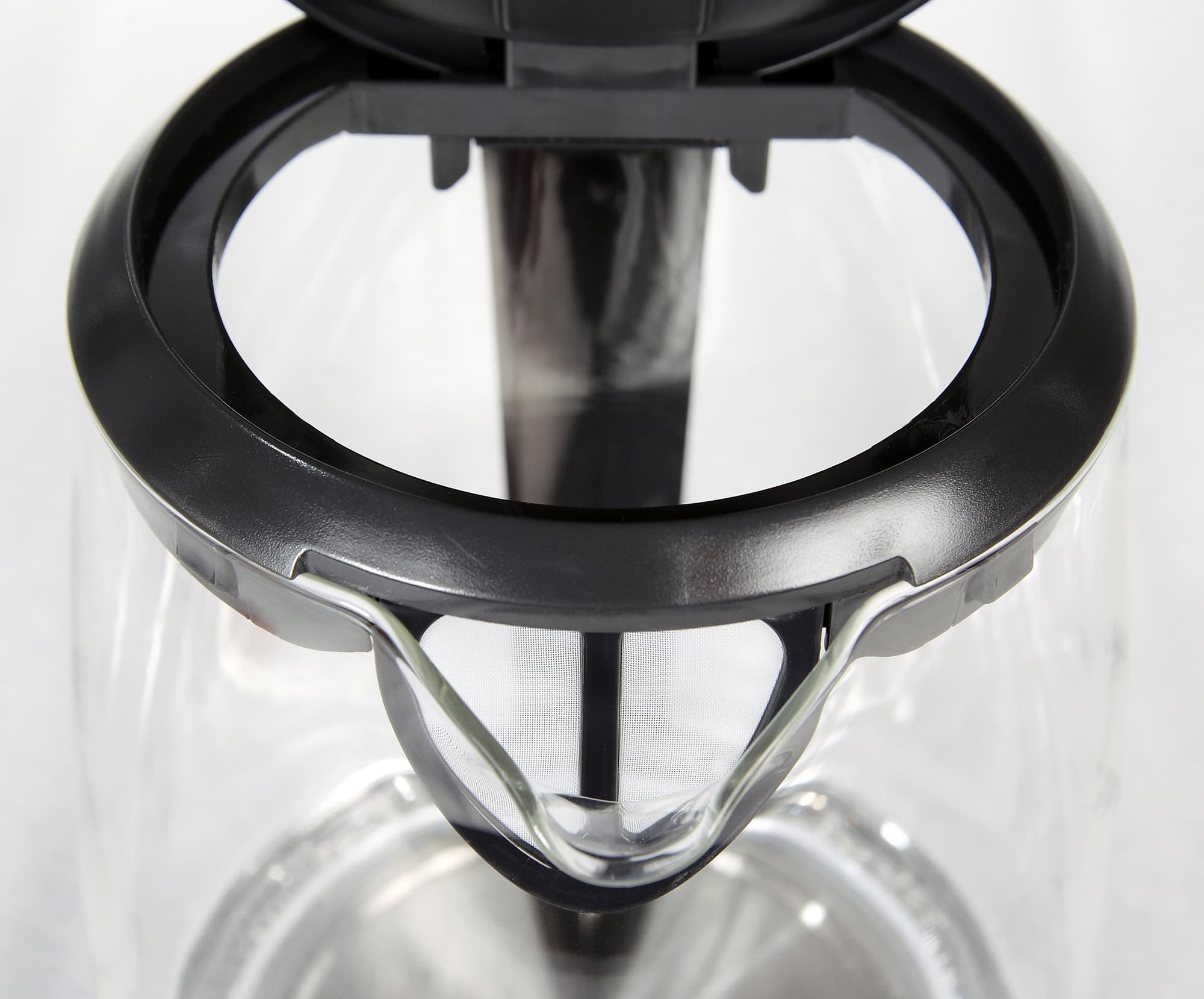Выглядит чайник достаточно просто и строго: сочетание стекла и черного пластика с редкими вкраплениями полированного металла (на самом деле это, конечно же, декоративное покрытие) работает беспроигрышно — такой прибор без труда встроится в практически любой интерьер.