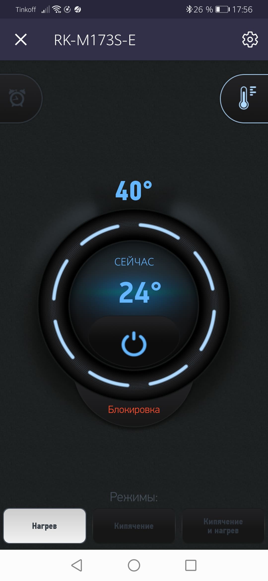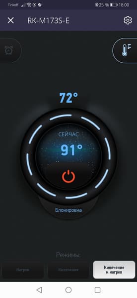 Все управление прибором осуществляется на главном экране приложения. Тут можно увидеть текущую температуру воды в чайнике, а в случае, если прибор включен — выбранный режим работы.