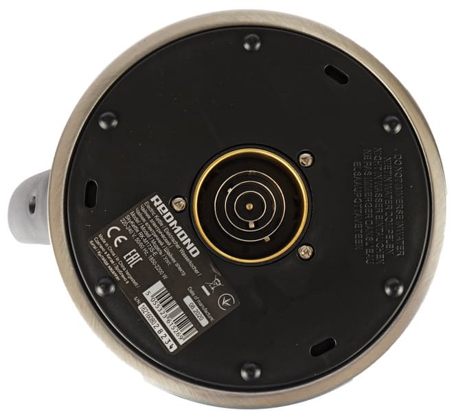 На нижней части чайника мы видим три отверстия и шильдик с краткой технической информацией о приборе. Контактная группа состоит из трех концентрических металлических колец и центрального штыря.