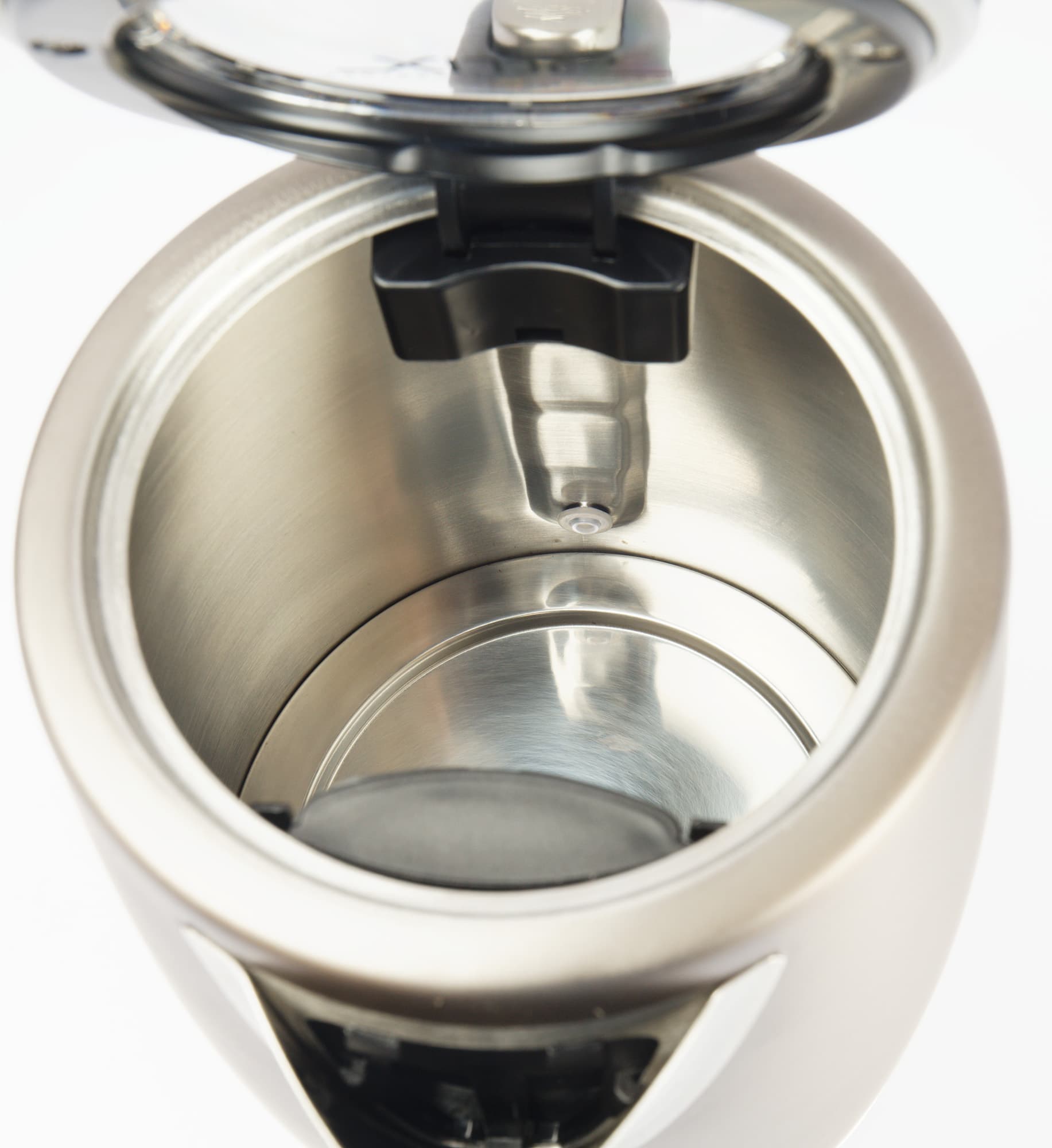 Крышка чайника сделана из прозрачного пластика и нержавеющей стали. С помощью кнопки она беззвучно и плавно откидывается на 70 градусов.