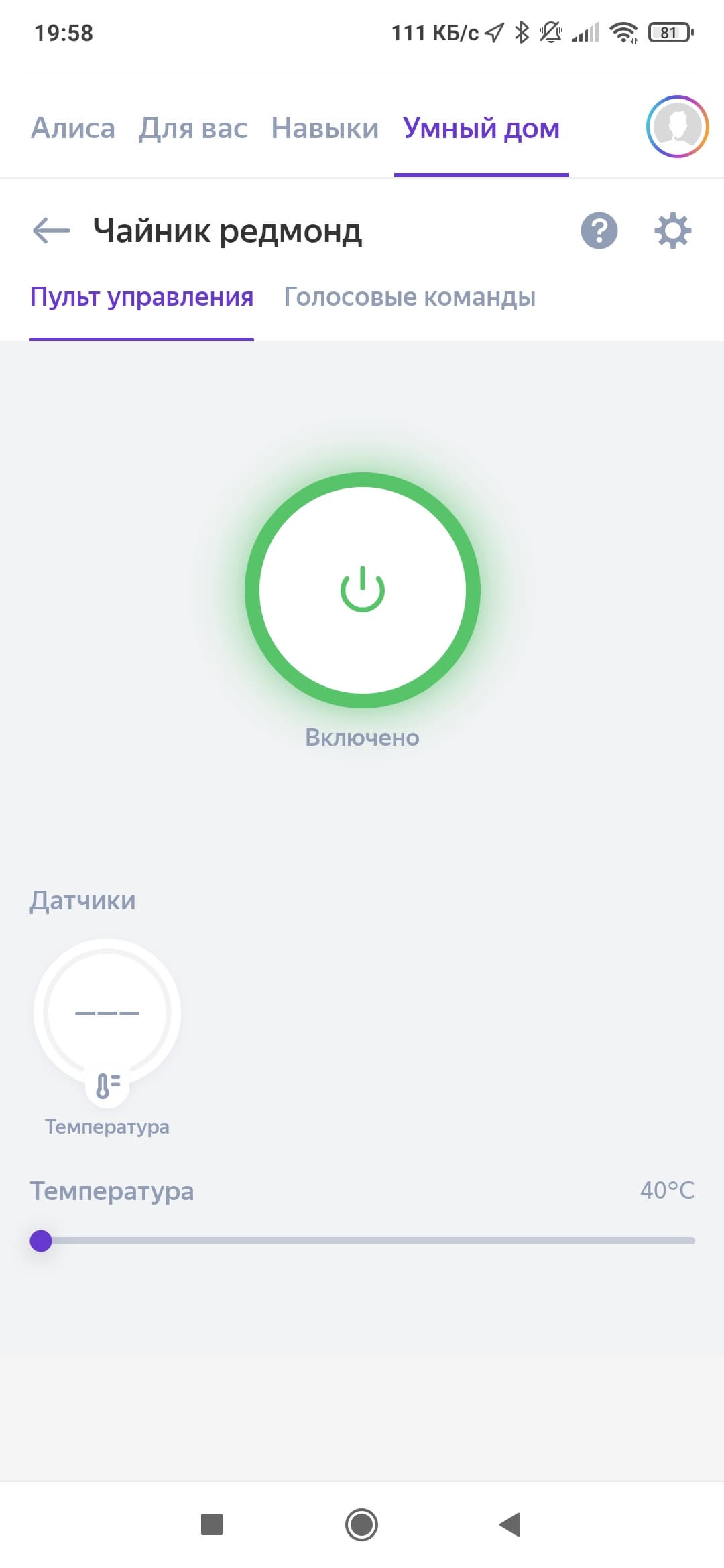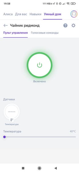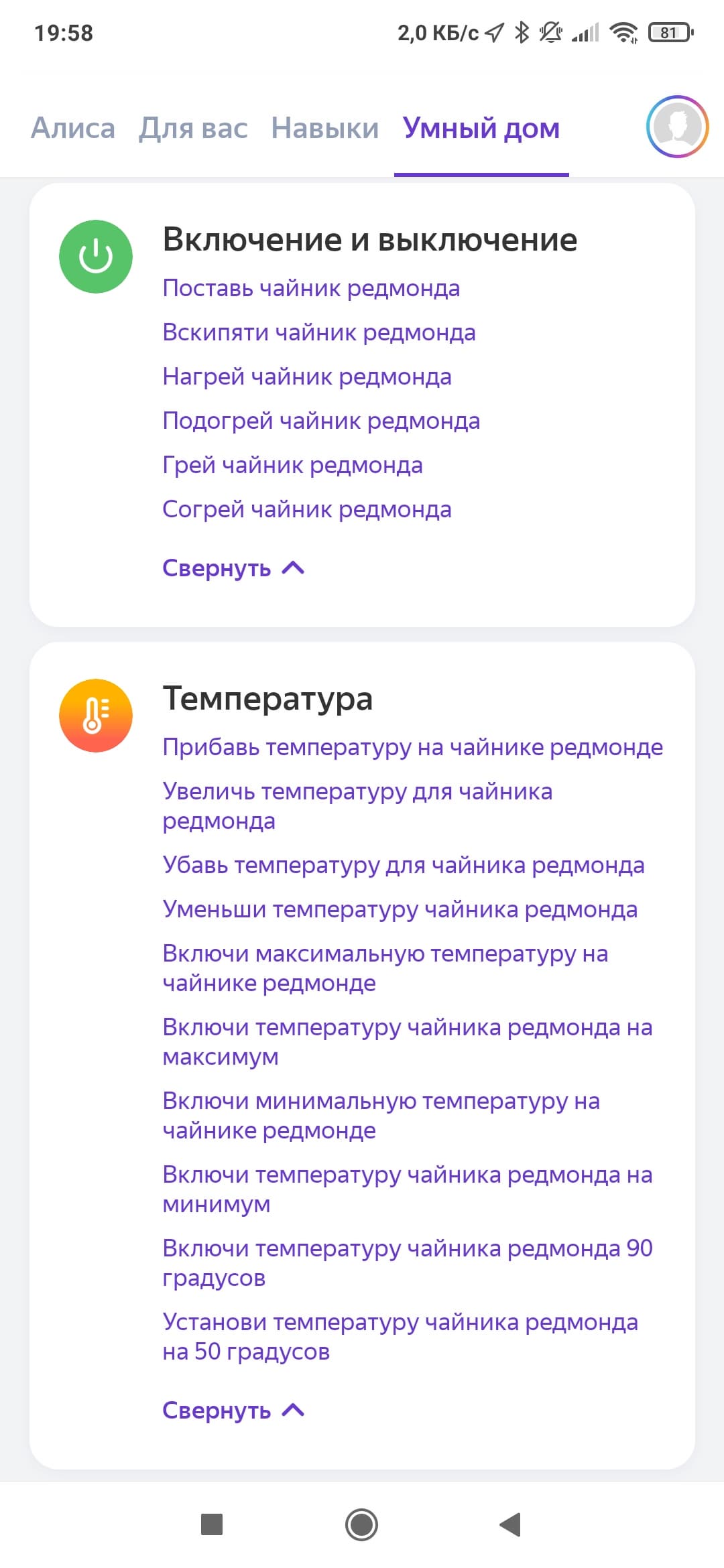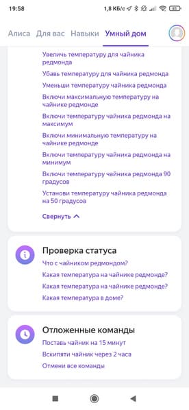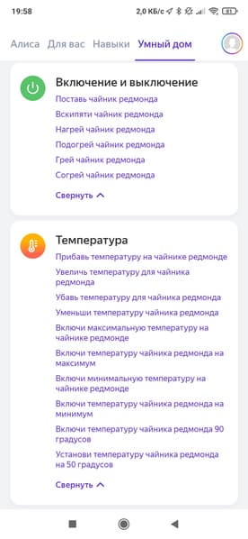 Список голосовых команд оказался вполне стандартным. Мы можем включить и выключить устройство, настроить температуру воды, проверить статус чайника, а также включить отложенный нагрев.