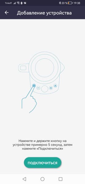 Подключаемся к чайнику с помощью смартфона, для этого нужно зажать кнопку «+» на приборе.