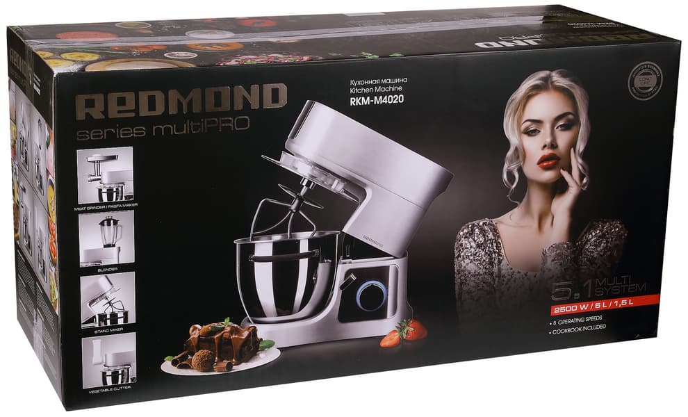 Redmond позиционирует кухонную машину RKM-M4020 как кухонный прибор «5 в 1». Устройство совмещает в себе функции планетарного миксера, овощерезки, стационарного блендера, мясорубки и машинки для приготовления пасты. Стоимость комбайна достаточно высока — однако затраты будут еще выше, если приобретать каждый из этих приборов по отдельности. Перед принятием решения о покупке пользователю нужно определить, будут ли востребованы все имеющиеся функции. Ведь дело не только в деньгах, но и в необходимости выделить место для хранения довольно крупного прибора и всех его многочисленных аксессуаров.