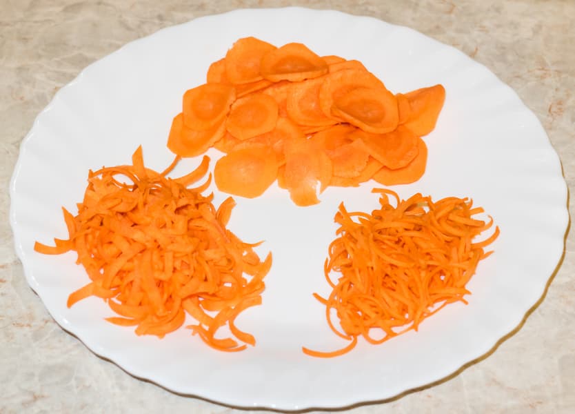 Затем установили барабан для крупной шинковки. Вновь не возникло никаких проблем — быстро, тихо и чисто морковь была натерта. Кусочки такого размера обычно используют для приготовления блюд с тепловой обработкой — тушения или поджаривания с другими овощами, варки супа и т. д.