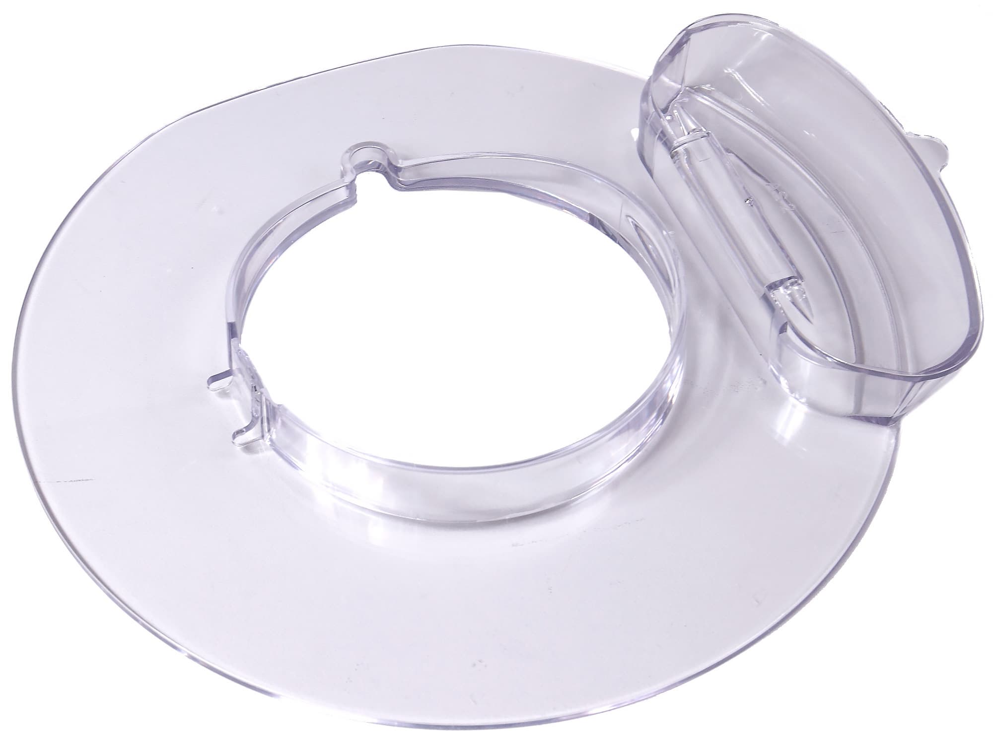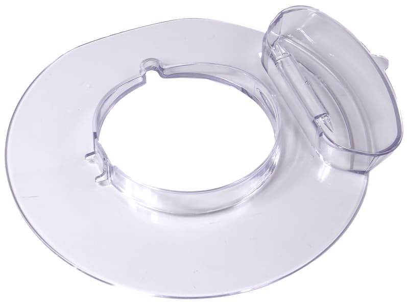 Защитная крышка закрепляется на приводном валу. Сначала нужно совместить паз во внутренней окружности крышки с выступом на краю приводного вала, затем надавить на крышку до щелчка. Крышка изготовлена из прозрачного пластика, что позволит наблюдать за ходом работы. Деталь оснащена широким отверстием для добавления ингредиентов во время работы. Более того, это отверстие прикрывается откидной крышечкой, чтобы мучная пыль и брызги не попали на приводной вал и корпус аппарата.