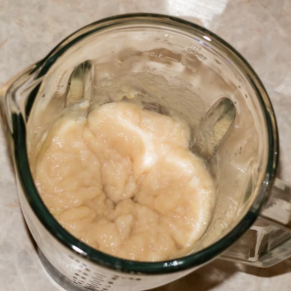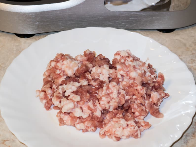 Нарезали на небольшие кусочки куриную грудку без шкурки весом 300 г и половину луковицы (85 г). Переложили продукты в кувшин блендера, добавили 50 мл воды и начали работу на низких скоростях. Ингредиенты, находящиеся под ножами, измельчились довольно быстро. Однако продукты, находящиеся выше, не опускались вниз. Возникла идея, что нужно было сначала измельчить лук с добавлением воды и только потом положить курицу. Однако будем следить за процессом, как он есть, отложив наши прекрасные озарения на следующий раз.