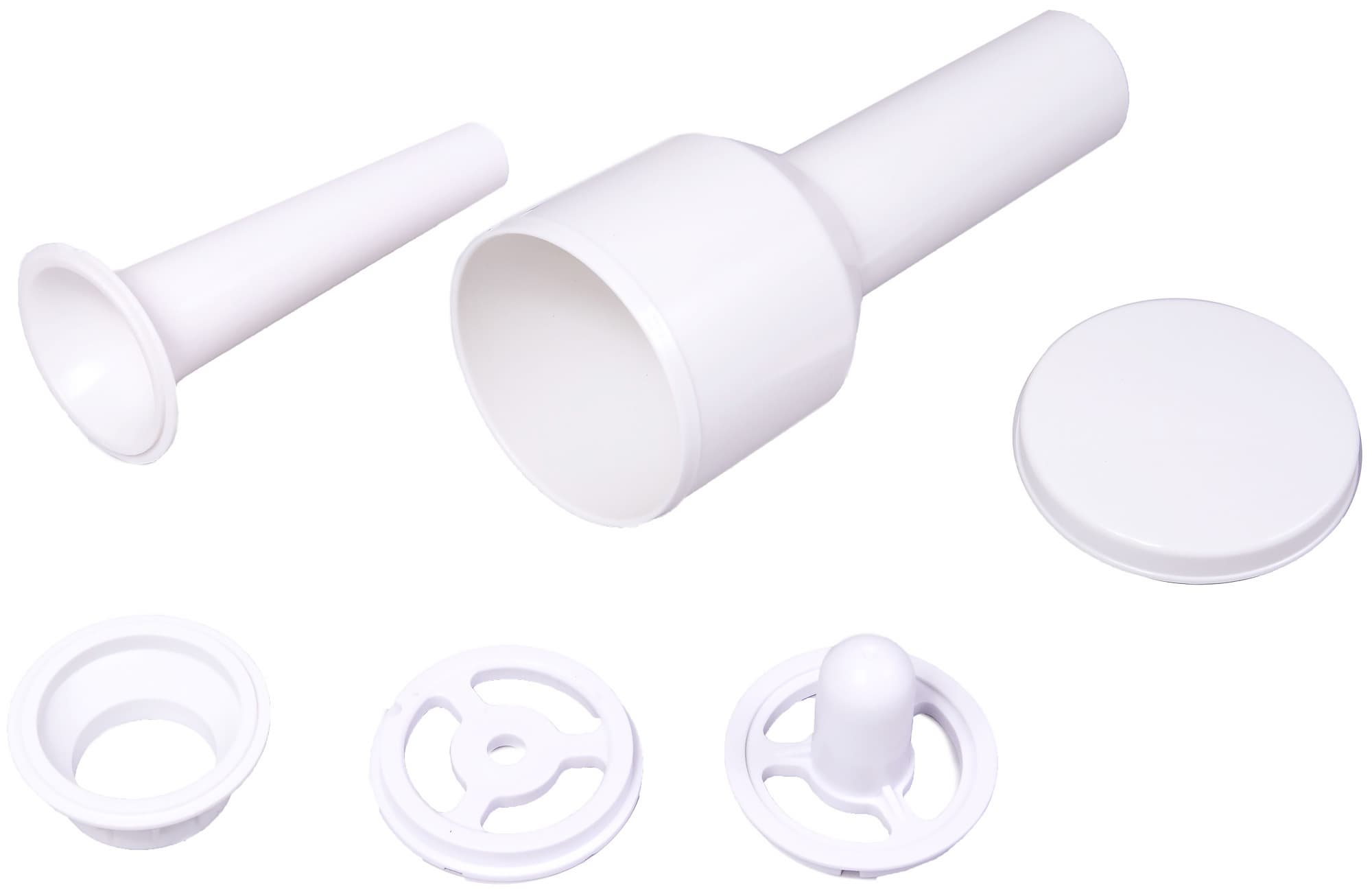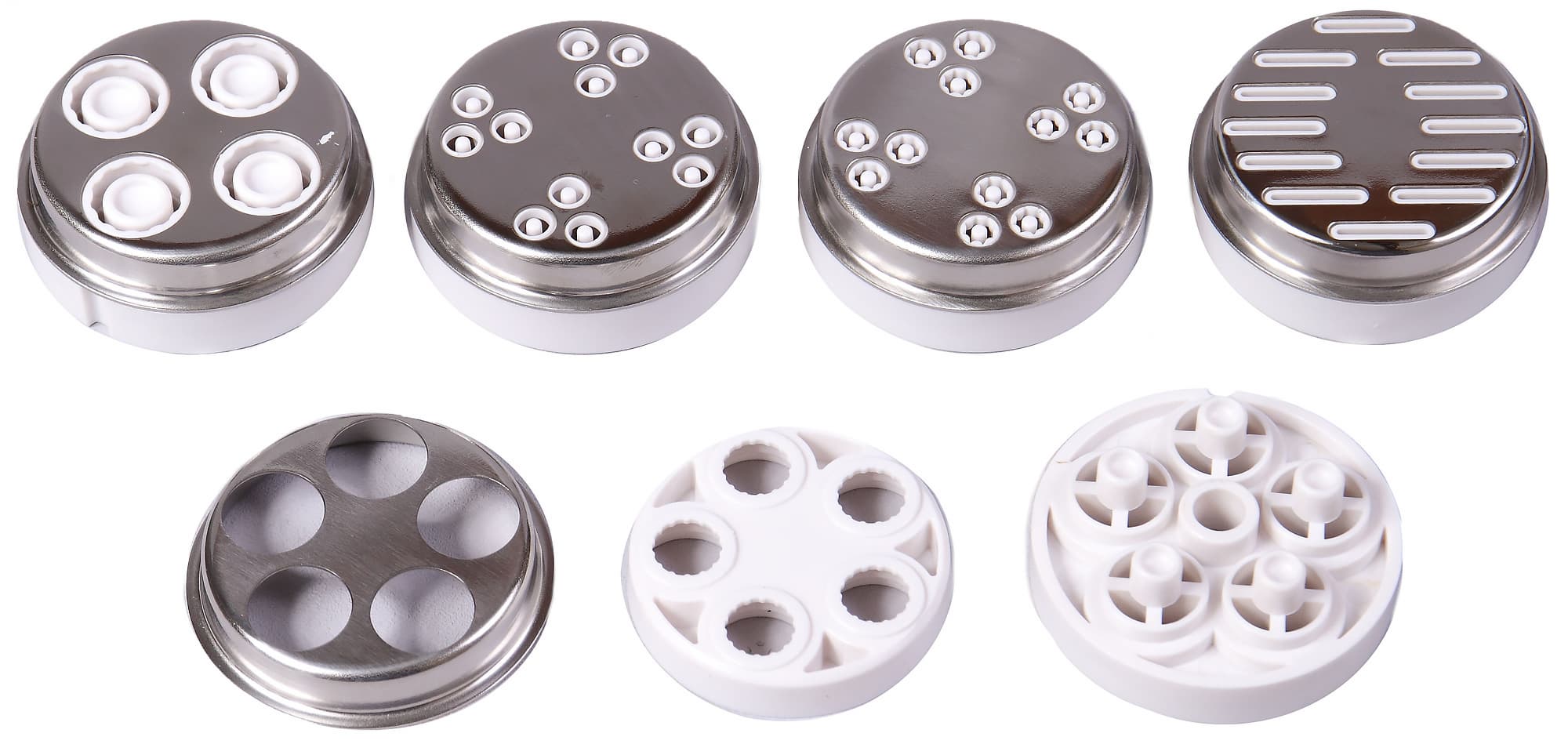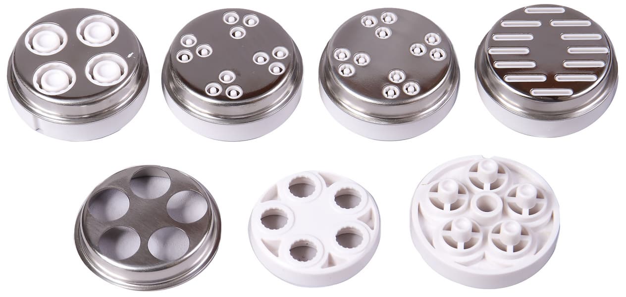 В комплект входит две решетки: с крупными (8 мм) и средними (около 4 мм) отверстиями. Толщина решеток — 5,5 мм. Экструдеры для пасты представляют собой насадки сложной формы, состоящие из двух или трех деталей, изготовленных из пластика и металла. Всего в комплекте пять насадок. Две из них выдавливают толстые макароны, две — тонкую пасту, одна предназначена для лапши. Отверстия расположены таким образом, чтобы не позволить пасте слипнуться. Во всех видах пасты, кроме лапши, предусмотрена внутренняя полость и разный узор на внешней стороне макаронного изделия.