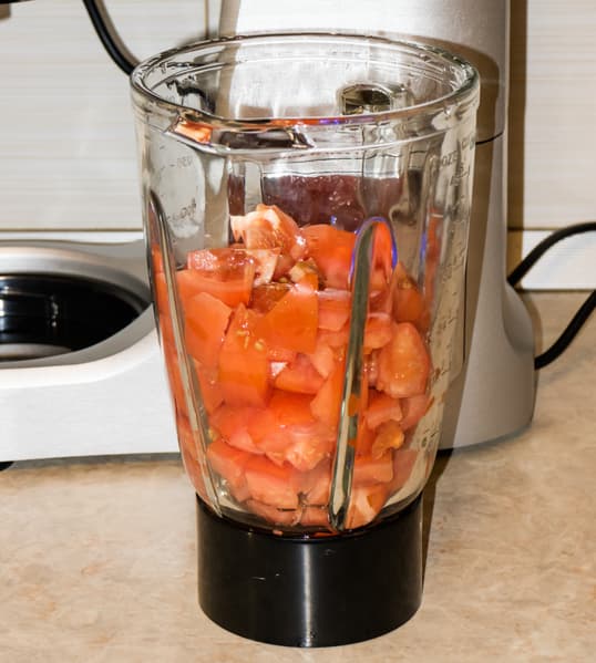 В качестве обязательного теста для блендеров мы используем измельчение помидоров. Обычно берем продукт весом 0,5 кг, однако вес может варьироваться в зависимости от вместительности стакана блендера. Для текущего теста использовали половину килограмма продукта. Удалили плодоножку, нарезали каждый помидор на небольшие кусочки.