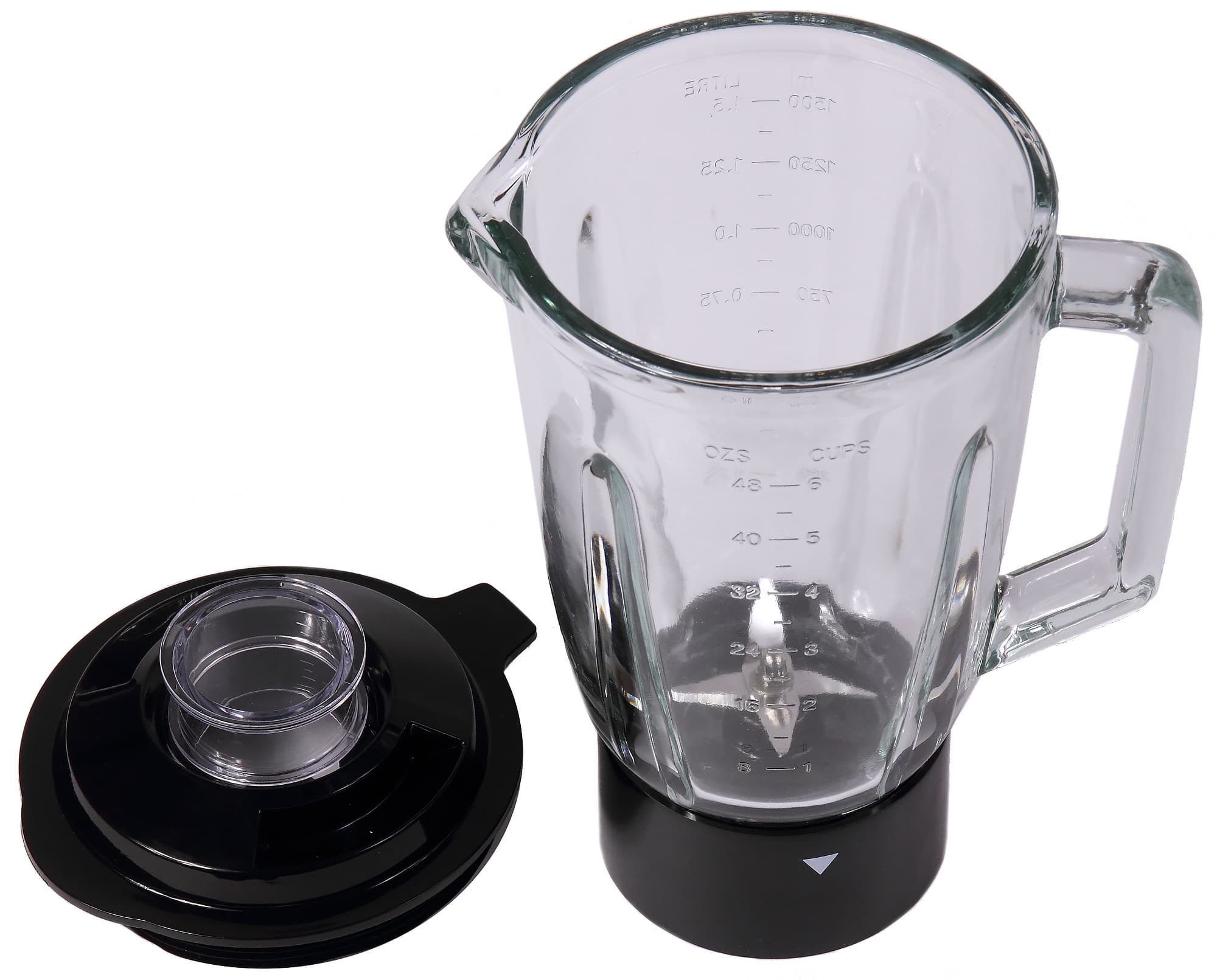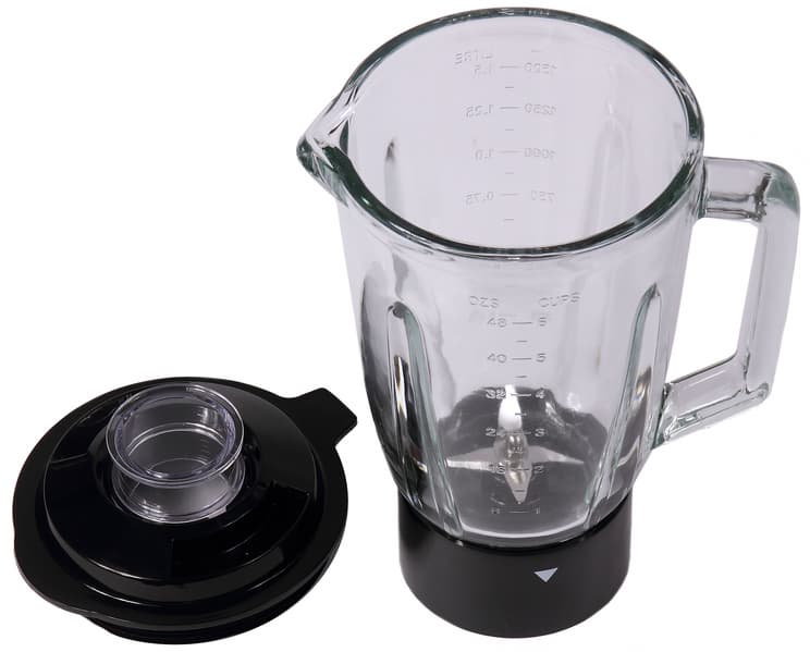 Кувшин блендера изготовлен из стекла. Толщина стенок в верхней части около 5 мм. Вес кувшина с крышкой составляет 1,68 кг. Емкость оснащена стеклянной ручкой и носиком для облегчения слива содержимого. Снаружи на стенки нанесены отметки объема в мл, литрах, чашках и унциях.