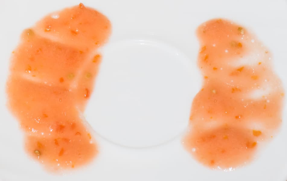 Начали работу с четвертой скорости, затем переключили на шестую. Уже через 20 секунд в кувшине образовалась однородная жидкая масса без отдельных кусочков томатов. Спустя минуту остановили работу и оценили качество измельчения помидоров. В массе встречаются мелкие фрагменты шкурки и непрорезанные косточки. Продолжили обработку еще в течение одной минуты. На фотографии с левой стороны представлен результат измельчения через минуту, справа — через две.