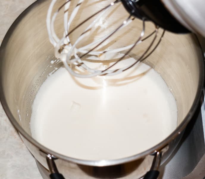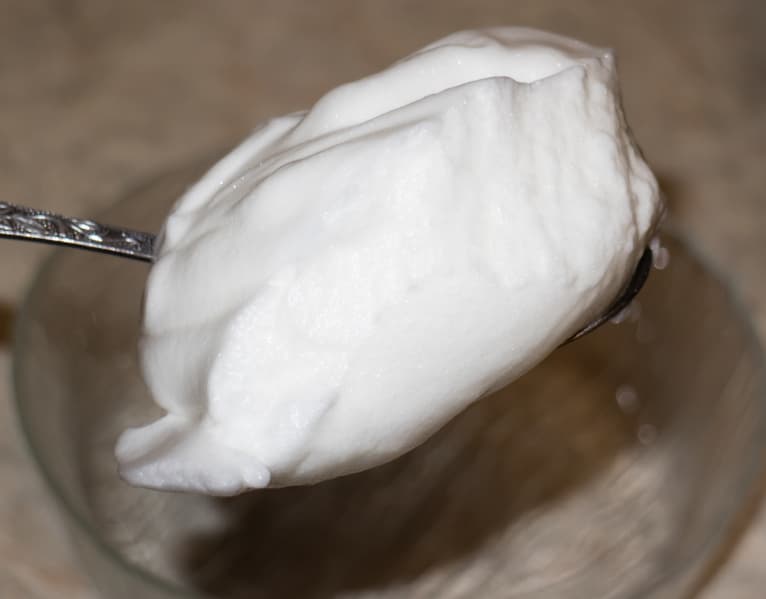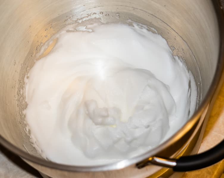 Стадии твердых пиков белки достигли через 5 минут взбивания. Минимальный объем для успешного взбивания ограничен тремя белками или ≈150-200 мл продукта.