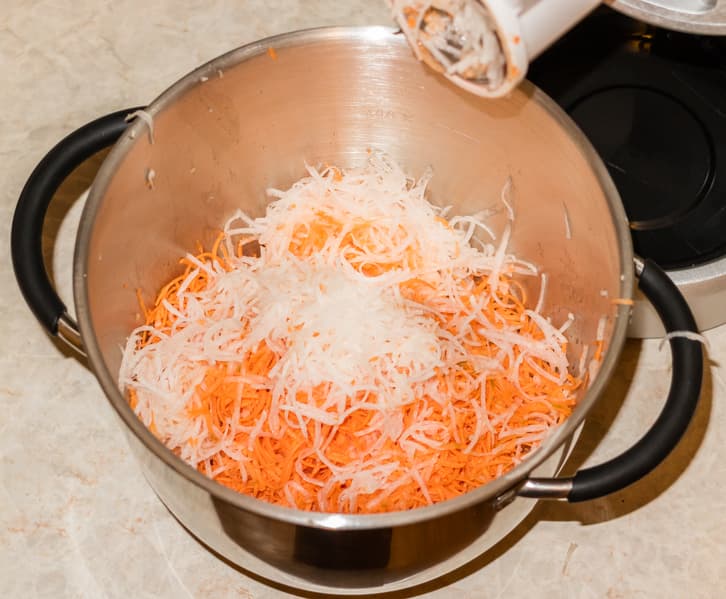 Напоследок установили терку с мелкими отверстиями. Получили продукты, идеально, на наш взгляд, натертые для приготовления салата из свежих овощей. За 1 минуту 45 секунд на пятой скорости было натерто 680 г моркови и дайкона — и никаких усилий, никаких мелких кусочков или брызг сока на столе. Очень быстро и чрезвычайно удобно. Те 2-3 кусочка, которые висят на краях чаши — это единственные раскиданные фрагменты продуктов.