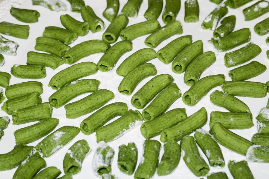 Положили тесто в полиэтиленовый пакет и убрали в холодильник на один час. Затем установили мясорубку с насадкой для изготовления пасты среднего диаметра. Нарезали тесто на небольшие брусочки, присыпали их мукой. Затем выкладывали в загрузочное отверстие кусочки теста, слегка надавливали толкателем. Когда выдавливающиеся макаронины достигали желаемой длины, останавливали работу и срезали их. Укладывали на присыпанное мукой большое блюдо.