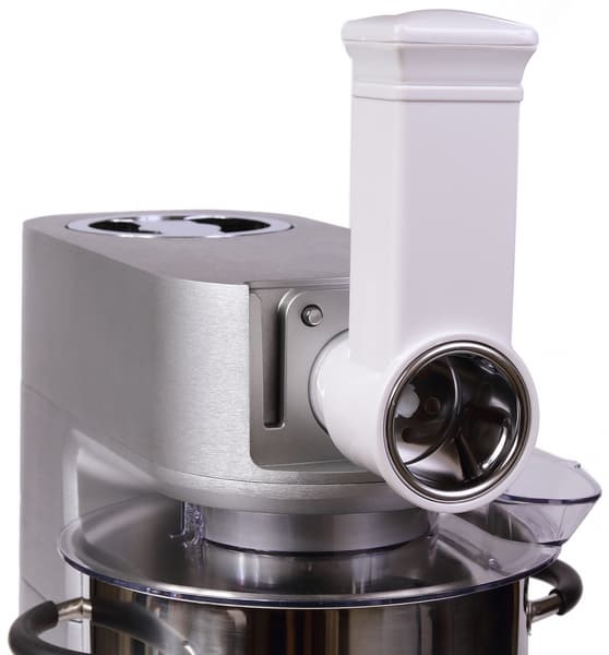 За все время тестирования и приготовления более десятка различных блюд кухонная машина не преподнесла нам никаких сюрпризов. Работала спокойно и безотказно. Сборка насадки для любой операции проста и стандартна. Заглушки, скрывающие приводные валы для работы с овощерезкой, мясорубкой и блендером, снимаются и надеваются легко, интуитивно понятным образом. Прибор оснащен защитой от неправильной сборки — машина не начнет работу, если основной блок находится в поднятом положении или насадка собрана неверно.