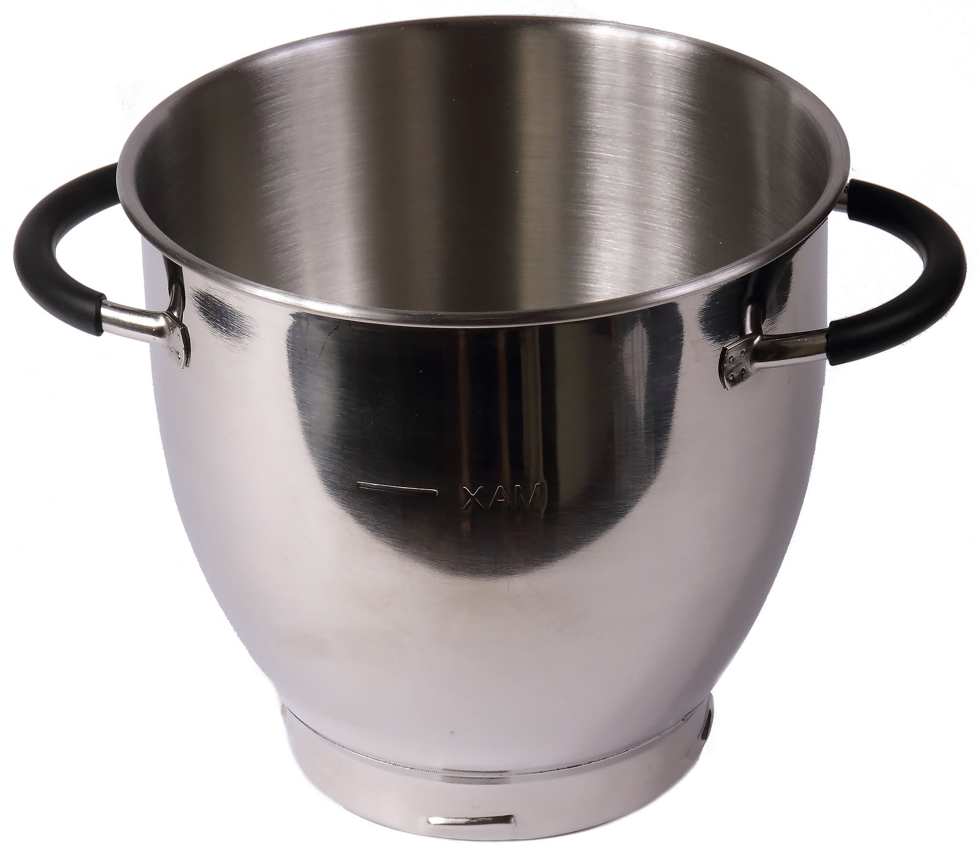 Относительно узкая и высокая чаша изготовлена из металла. Оснащена двумя ручками с прорезиненной поверхностью. Забегая вперед, отметим, что решение с ручками признано удачным — чашу удобно устанавливать, переносить и выливать готовое содержимое в формы. С внутренней и внешней стороны на стенке чаши имеется отметка о максимальном объеме продуктов. По центру дна с внутренней стороны расположено небольшое конусообразное возвышение, что позволит эффективнее взбивать и замешивать продукты в малом объеме.