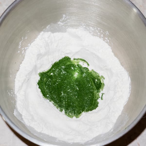 В чашу миксера всыпали 300 г муки, сделали углубление и вылили яично-шпинатную заготовку.