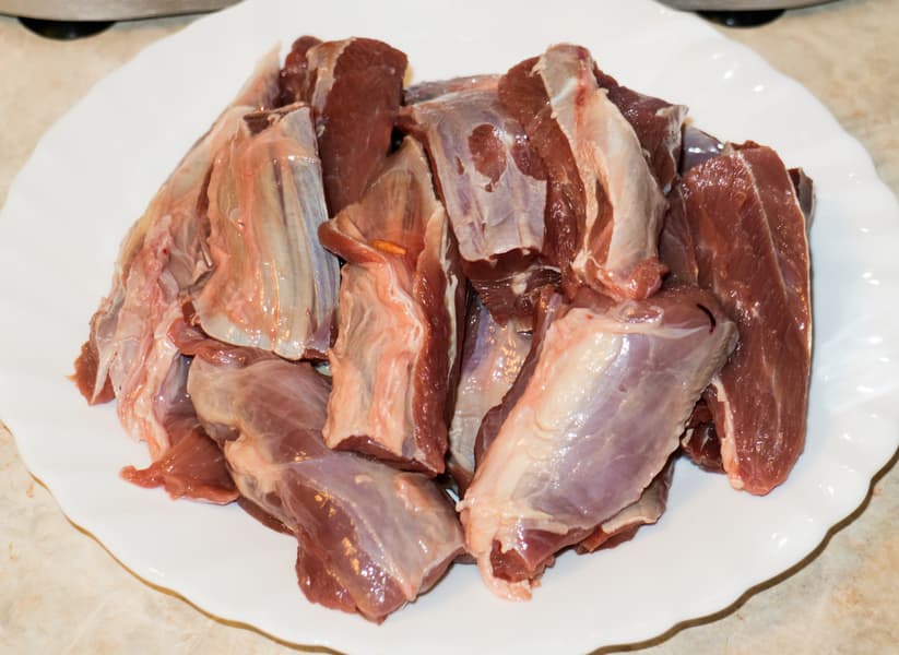 После теста на производительность мы проверяем способности мясорубки по переработке сложного мяса с обилием жил. В данном случае использовали мясо говяжьей голяшки. Нарезали мясо на кусочки, свободно проходящие в раструб мясорубки, установили решетку с крупным диаметром отверстий и запустили работу на пятой скорости.