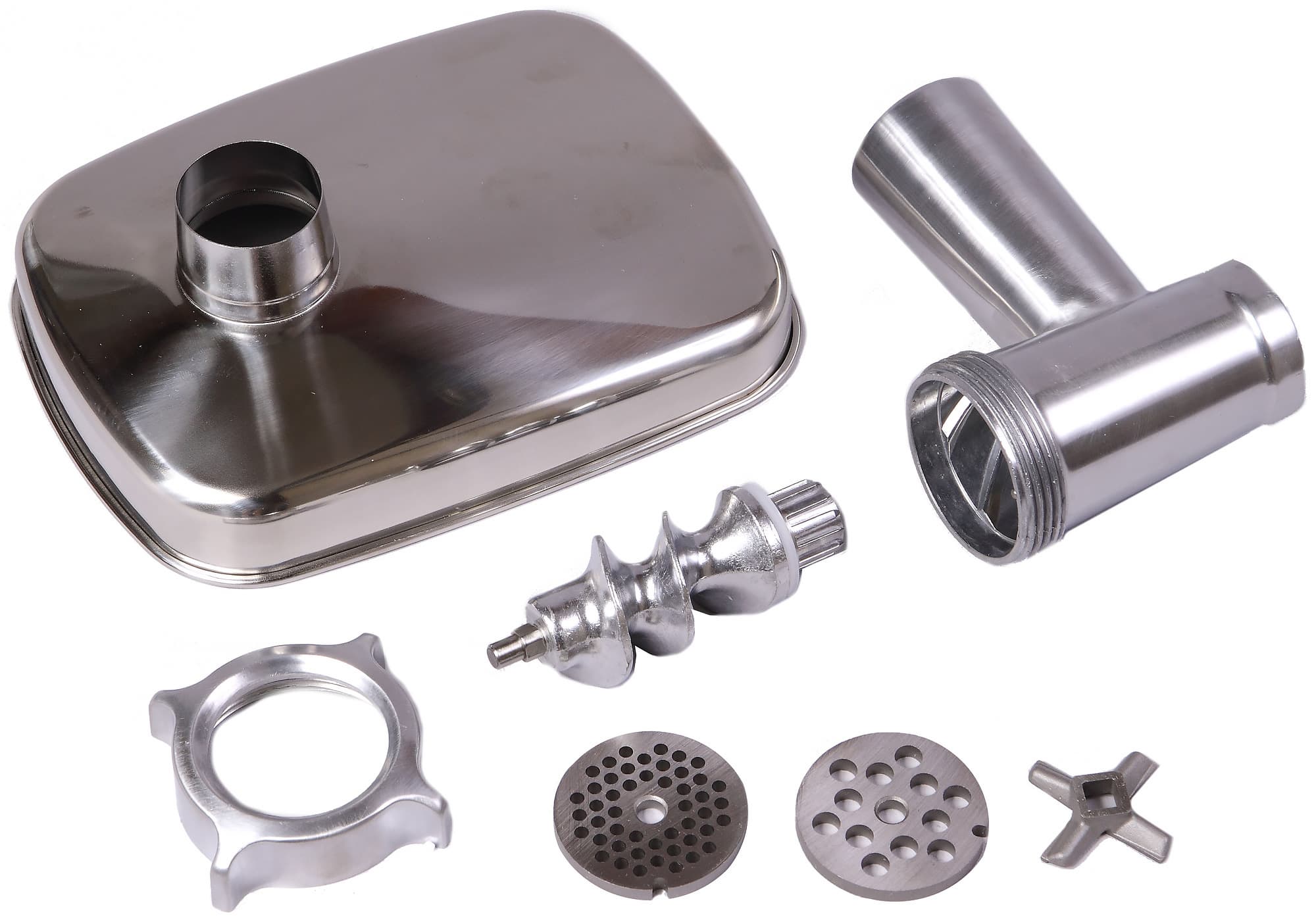Насадка-мясорубка также имеет типовую конструкцию и форму отдельных деталей. Внешняя поверхность корпуса и кольцевой гайки прекрасно обработана — металл глянцевый и гладкий на ощупь. На поверхностях шнека, внутренней стороны фиксирующего кольца и самого корпуса встречаются зазубрины и царапины. В общем-то, ничего страшного мы в этом не видим — такая ситуация свойственна для мясорубок средней ценовой категории. Обычный потребитель, возможно, даже не заметит этих недостатков. При сборке ножевая решетка выступает над краем корпуса на 3-3,5 мм, однако щель между этими деталями минимальна. Зато загрузочный лоток не только красиво выглядит, но и довольно вместителен. Глубина его от 3,5 до 4,5 см, габариты — 22×17 см.