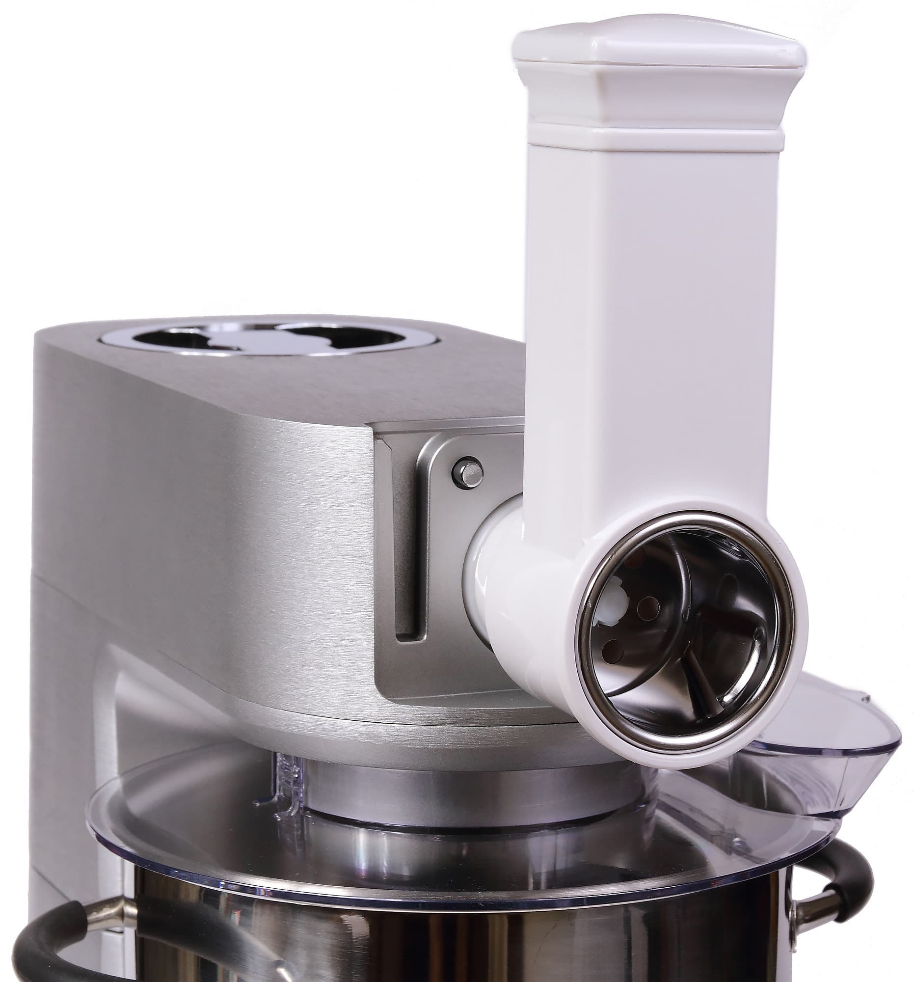 Кстати, еще раз не рекомендуем использовать более высокую скорость. В этом случае натертый продукт не успевает выпасть из барабана в чашу и остается внутри, постепенно спрессовываясь.