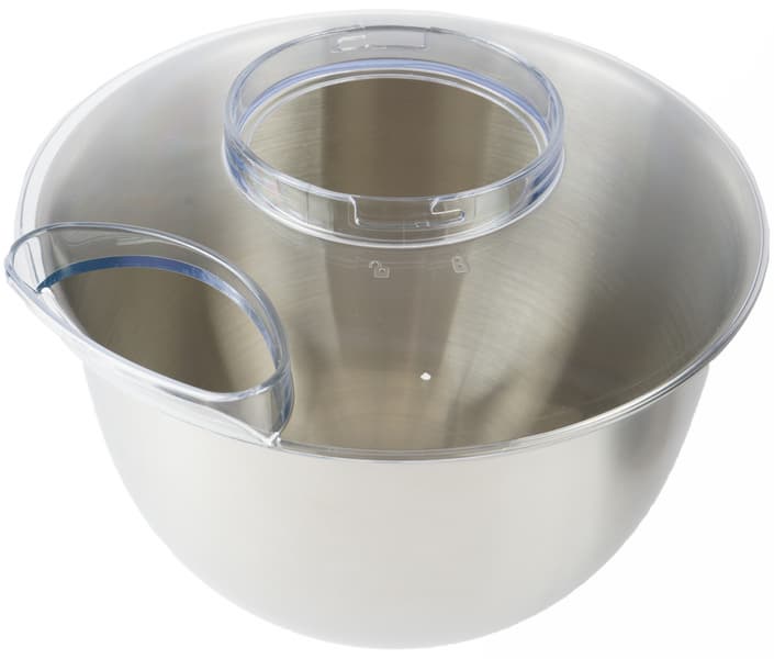 Пятилитровая чаша отполирована снаружи. К ней прилагается прозрачная пластиковая крышка, правда закрепляется она на корпусе — поворотом.