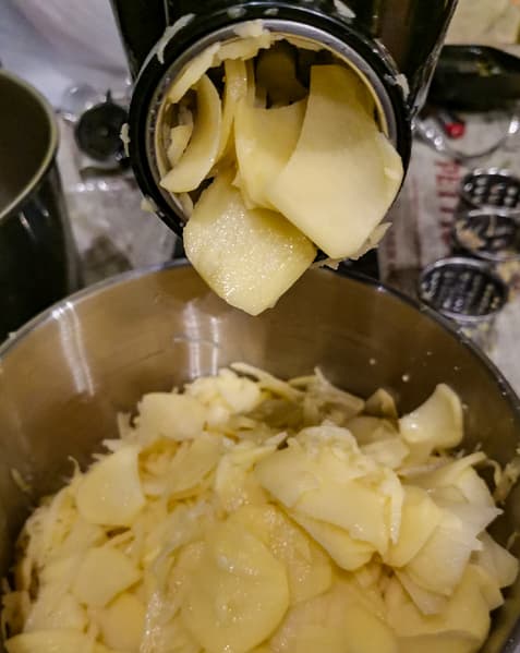 Нарезка картофеля тонкими ломтиками тоже достаточно удобная, но красивых одинаковых кусочков будет добиться сложно из-за того, что в приемное отверстие блока по ширине проходят клубни, только нарезанные на половинки или четвертинки.