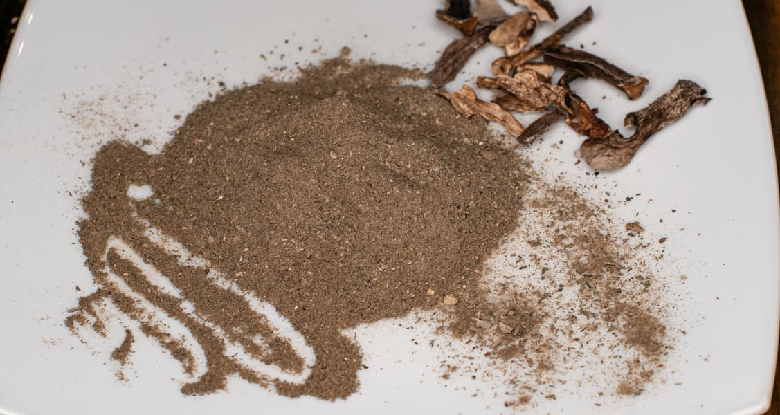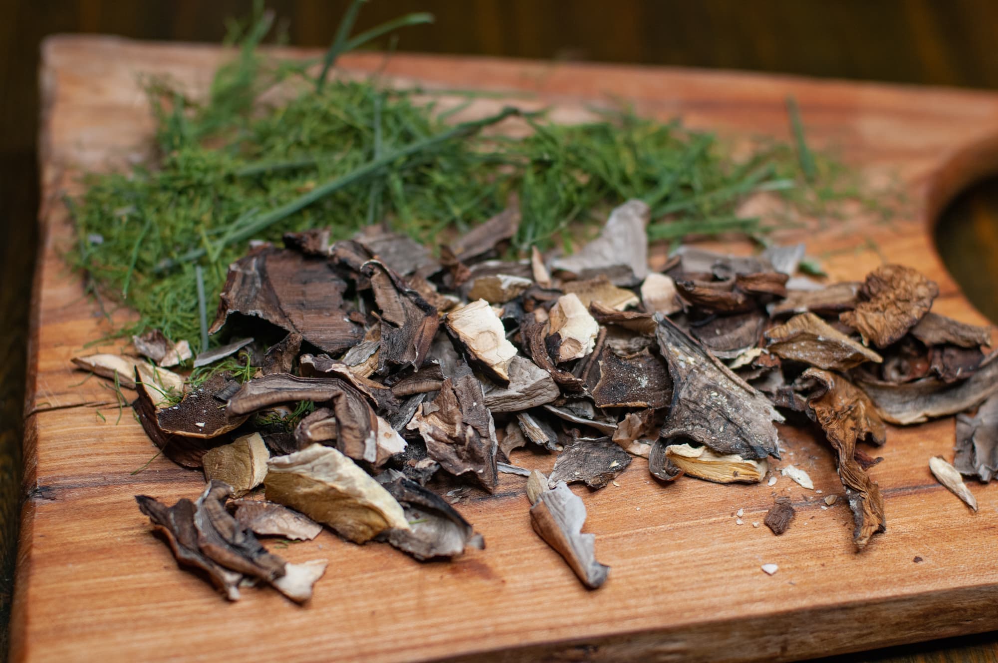 Мы решили испытать блендер при работе с сухим сырьем. Для этого взяли сушеные грибы (смесь разных) и сушеный укроп с грубыми стеблями. Засыпали все в сухой кувшин блендера и измельчали на разной скорости, периодически снимая с базы и встряхивая кувшин, около двух минут.