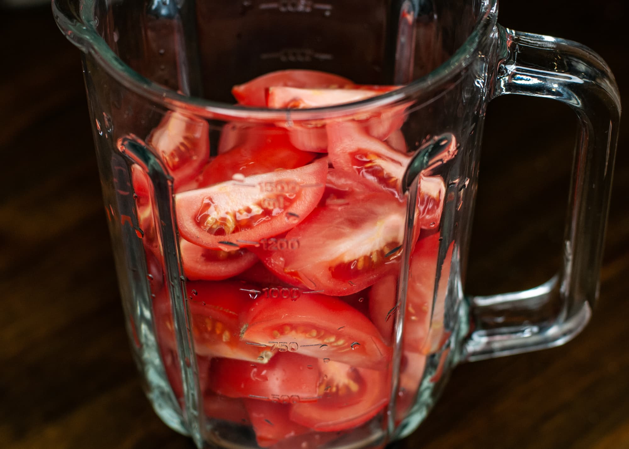 Мы взяли сливовидные томаты, порезали их на четвертинки, плодоножки не вырезали, так как они оказались совсем маленькими. Нарезанными томатами заполнили ⅔ кувшина, измельчали сначала в импульсном режиме около 30 секунд и 30 секунд на высокой скорости.
