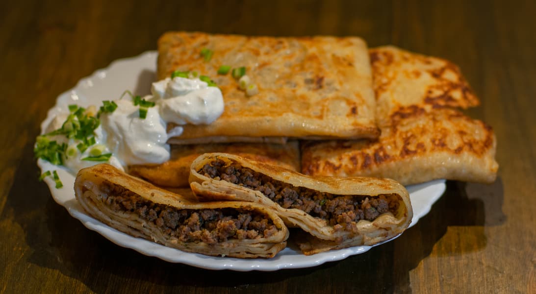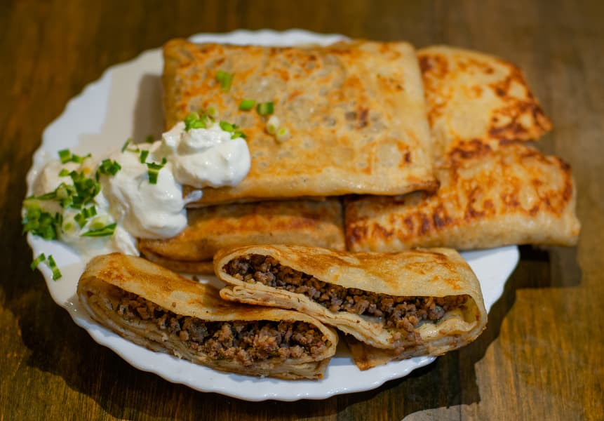 Из теста сделали блинчики, начинили фаршем, подали со сметаной и зеленью.