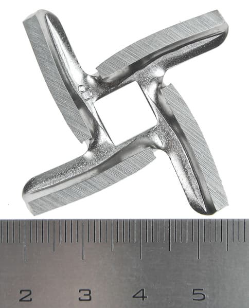 Прокручивали в мясорубке на 5-й скорости, быстро подавая мясо к шнеку, но не давя на него толкателем. За 1 минуту работы прибора мы смогли получить 1,2 кг фарша, что является очень хорошим результатом для мясорубок, тем более для устройств, у которых мясорубка — лишь дополнительный аксессуар. Мясо не давилось, а рубилось. С обработкой жира проблем не возникло, на нож не намотались жилы. Благодаря строению блокирующей гайки, при сильном затягивании, снять ее не очень сложно.
