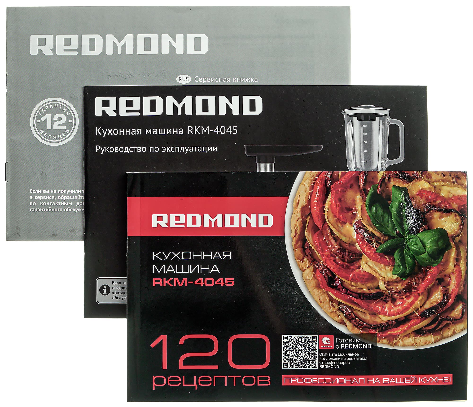 К комбайну Redmond RKM-4045 прилагается руководство по эксплуатации, гарантийный талон и сборник 120 рецептов.