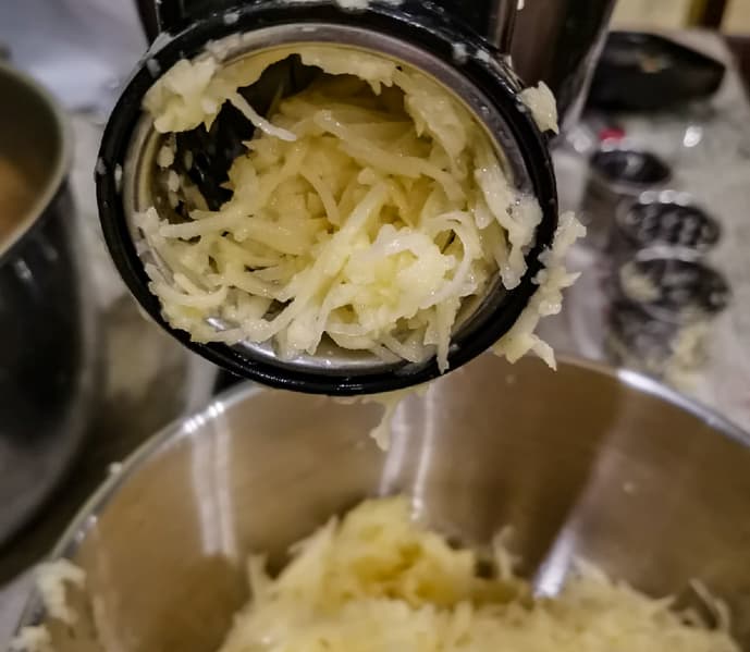 Картофель для драников хорошо получается на мелкой терке, практически не забивается между теркой и блоком.