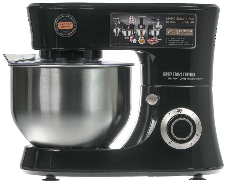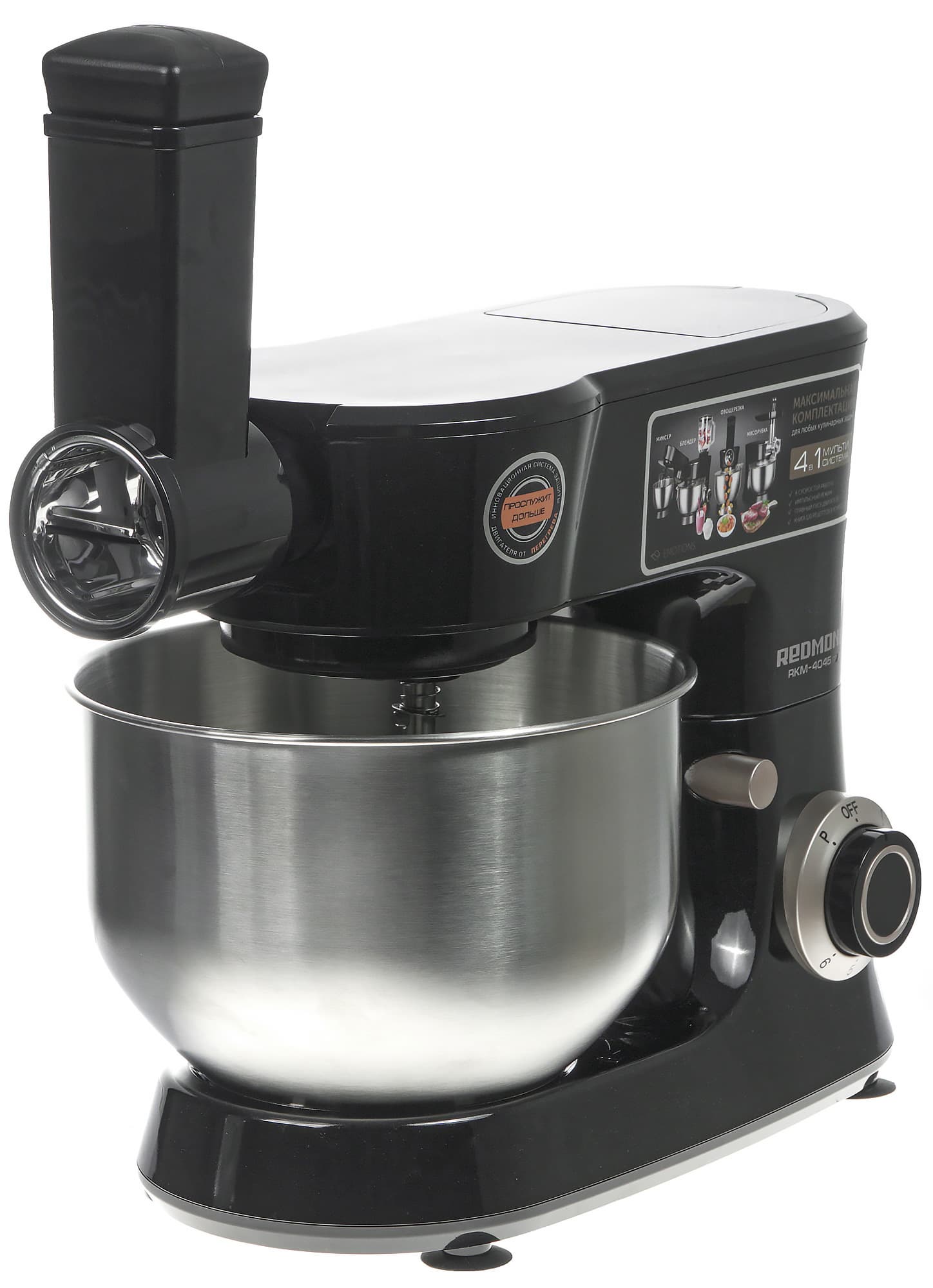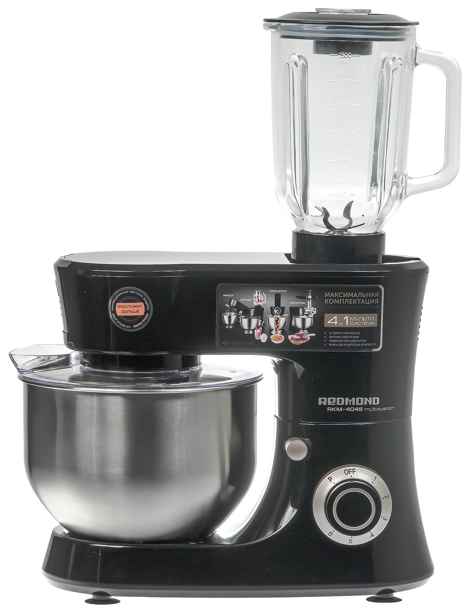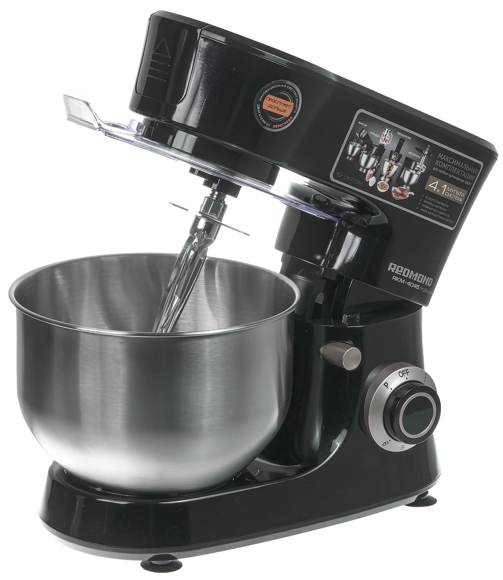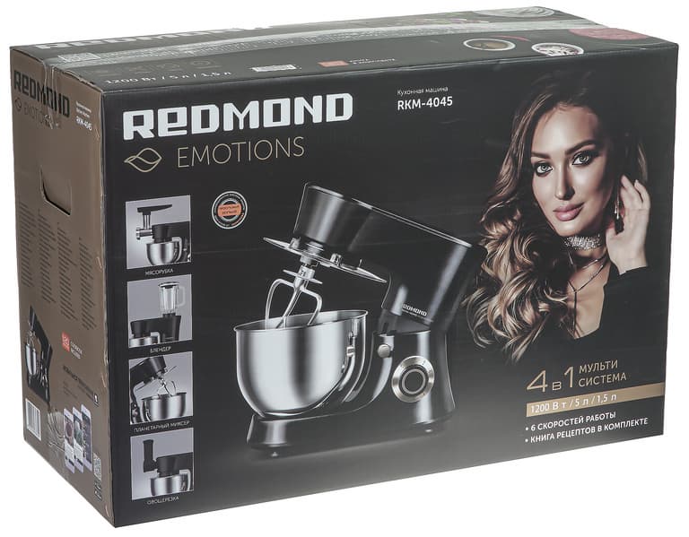 Кухонная машина Redmond RKM-4045 совмещает в себе планетарный миксер, блендер, мясорубку и овощерезку — самые необходимые приборы для повседневного приготовления пищи. С одной стороны, такое совмещение экономит место на кухне, ведь вместо четырех приборов мы получаем один.