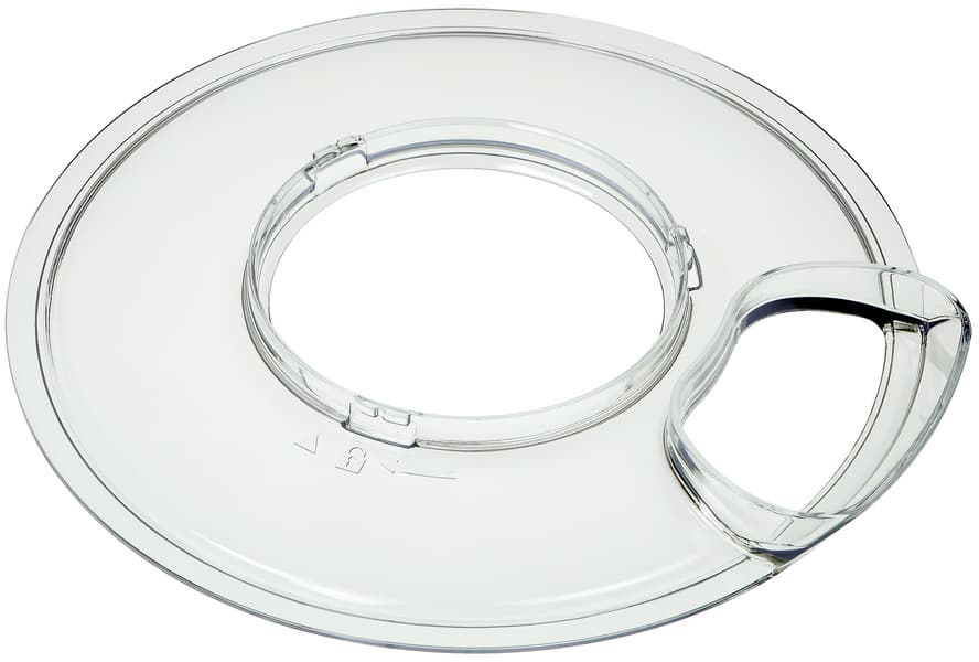 Крышка чаши миксера сделана из прозрачного пластика и имеет загрузочное отверстие для добавления продуктов в процессе готовки. Чаша надевается и фиксируется на моторном блоке.