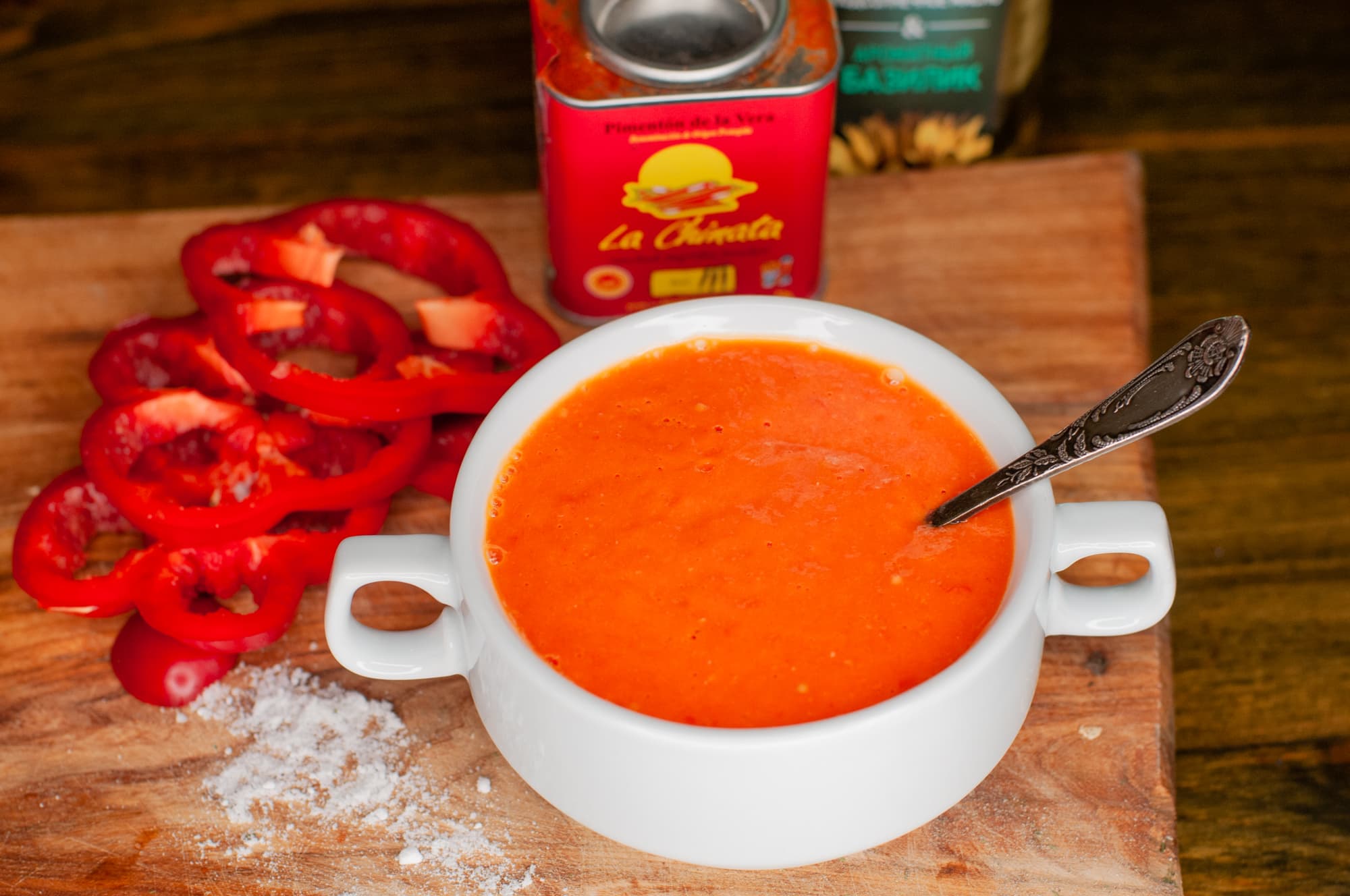В полученную массу мы добавили болгарский и острый перец, копченую паприку, соль и масло с базиликом и получили прекрасную основу для супа гаспаччо.